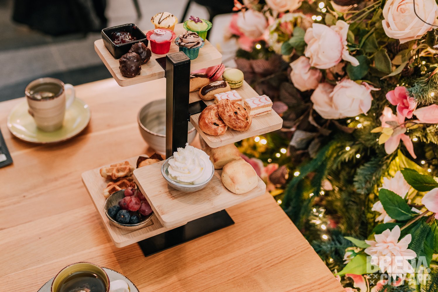 We worden vriendelijk welkom geheten door het personeel die ons naar een prachtig tafeltje naast een gigantisch versierde kerstboom begeleidt. We kijken onze ogen uit met al deze mooie versiering in de zaak en nemen rustig plaats. De versierde kerstboom steelt absoluut de show met alle mooie bloemen en lichtjes die erin hangen. We zijn nu al helemaal enthousiast en klaar voor de high tea!