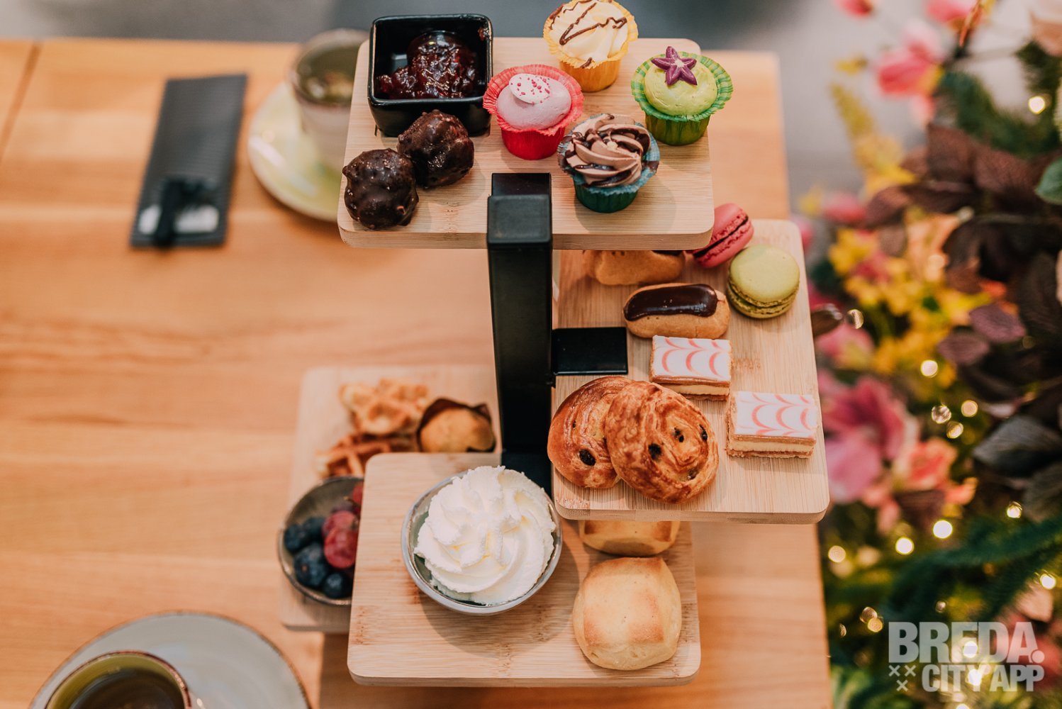 We zijn klaar voor de tweede ronde. Op tafel krijgen we weer een grote etagere, deze keer vol met zoetigheden. Wat is dit een plaatje om te zien! Bovenop staan wat schattige cakejes die zeker de show stelen met hun felle kleuren. Op deze plank staan ook mini tompoucen, muffins, macarons, scones met slagroom en wafels. Het is een feestje om al deze lekkernijen bij elkaar te zien en ze smaken naar kerst!