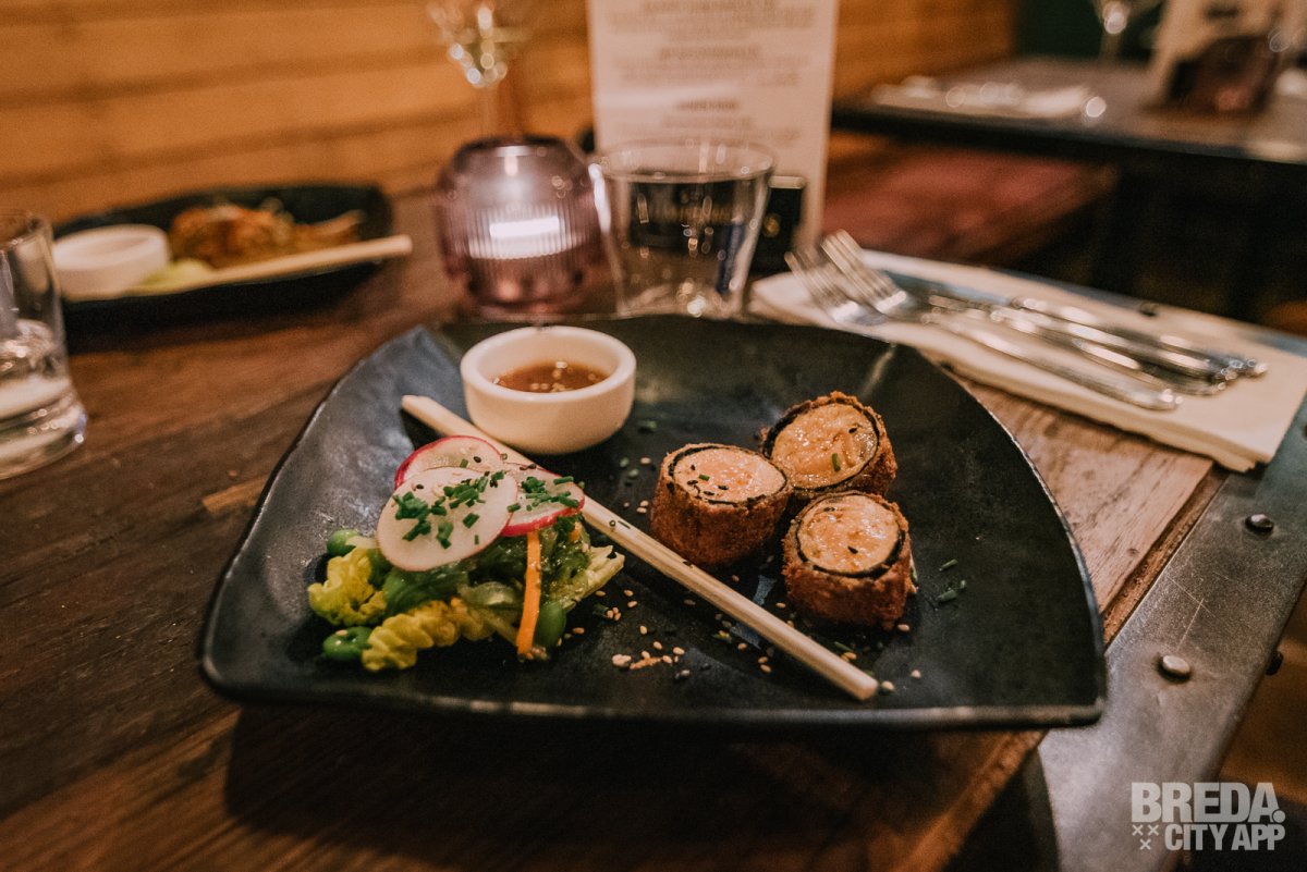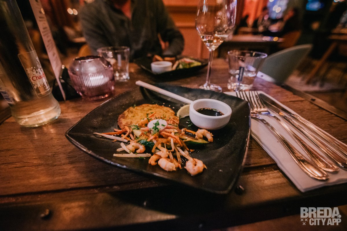 We kiezen beiden voor een Oosters voorgerecht: een krokante zalmrol met edamame bonen, wakemesalade en Japanse dressing en een Vietnamese pannenkoek met gewokte garnalen, bosui, koriander, taugé en een zoetzure dip van ketjap en limoen. Doordat het krokantje van de zalmrol flinterdun is, komt de natuurlijke smaak van de vis mooi naar boven. Het Vietnamese pannenkoekje is een kleine delicatesse uit het Oosten. De combinatie van groenten, de kruiden en het sausje maakt het tot een origineel voorgerecht. Perfecte porties en mooi opgemaakt op een Oosters bord: dit smaakt naar meer!
