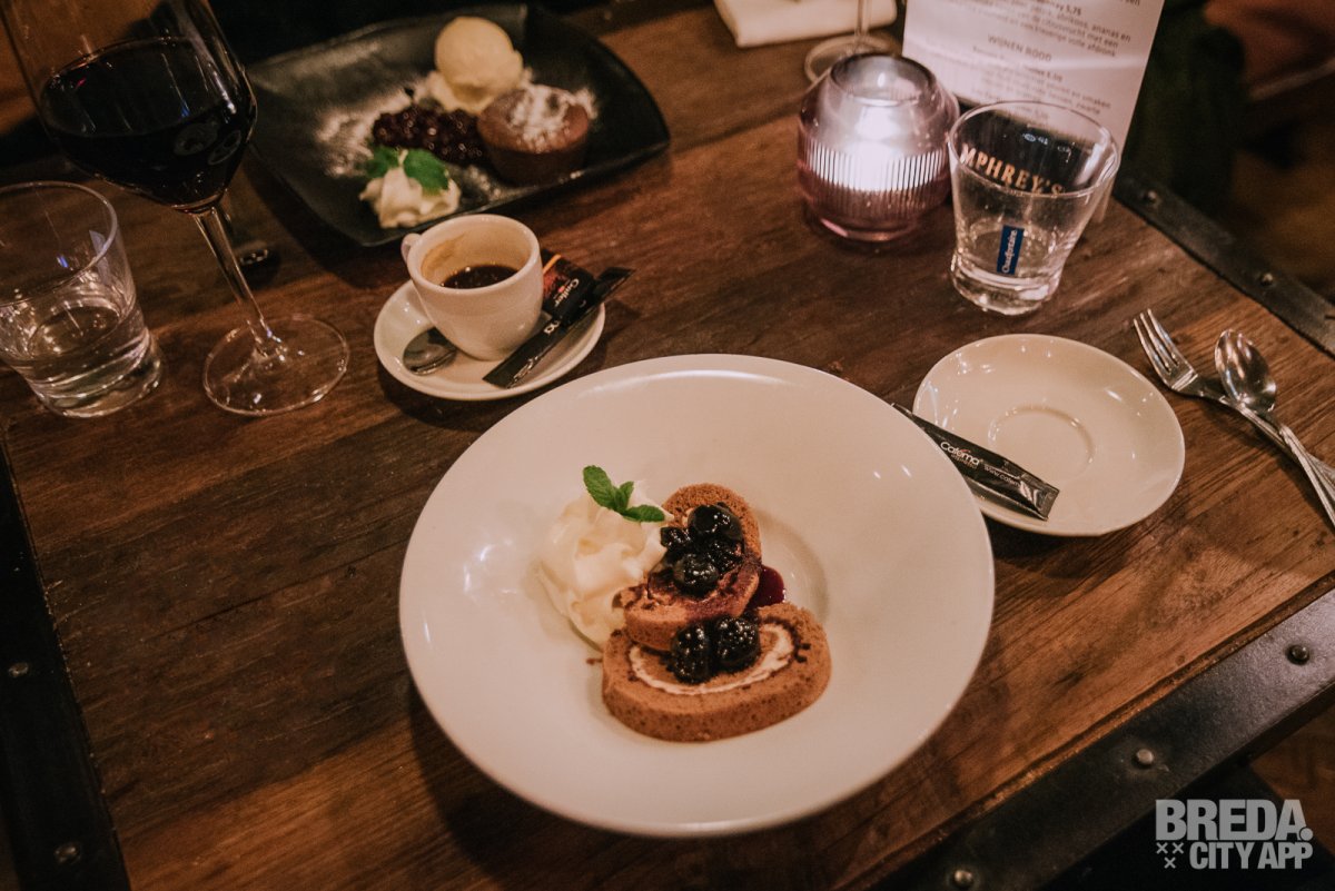 Of er nog ruimte is voor een toetje? Altijd! Op het menu vind je onder andere gebakken peer met kaneel, walnoot en kaneel-roomijs, een kaasplankje met kletzenbrood en vijgenconfituur en natuurlijk de huisgemaakte tiramisu. We besluiten om een Zwitserse rol gevuld met amarena kersen en een goddelijke chocolade fondant met roomijs te nemen. De chocolade druipt elegant uit het krokante laagje en ik moet zeggen: dat is een hele mooie afsluiter! Ook de amarena kersen zijn een ware toevoeging op de Zwitserse rol. Als je houdt van zoet, moet je deze echt eens proberen!