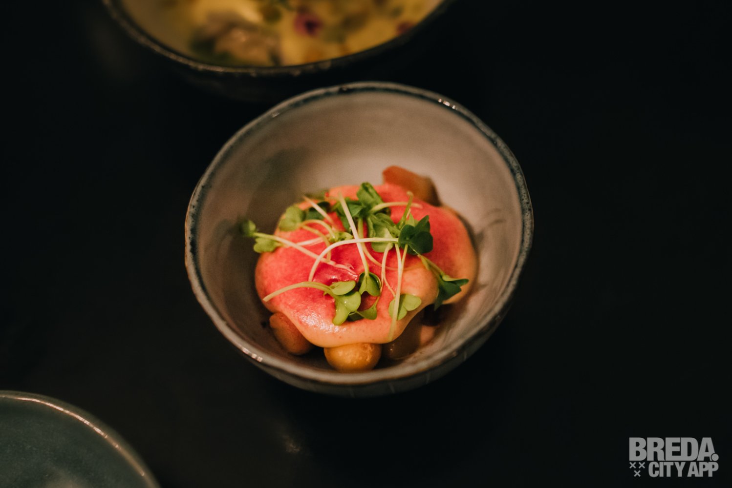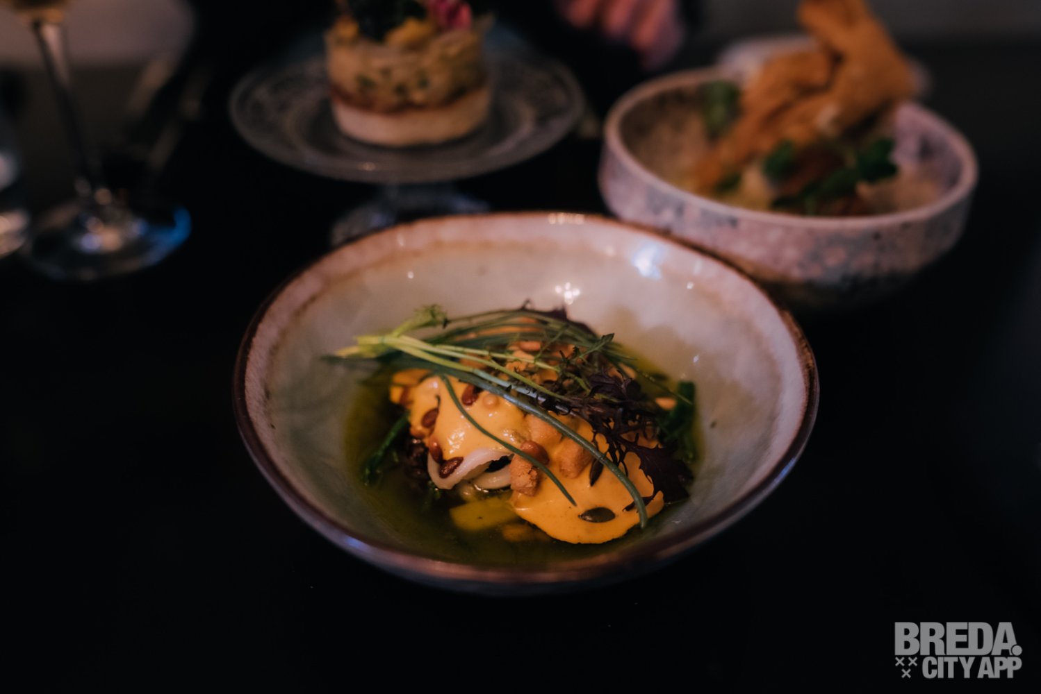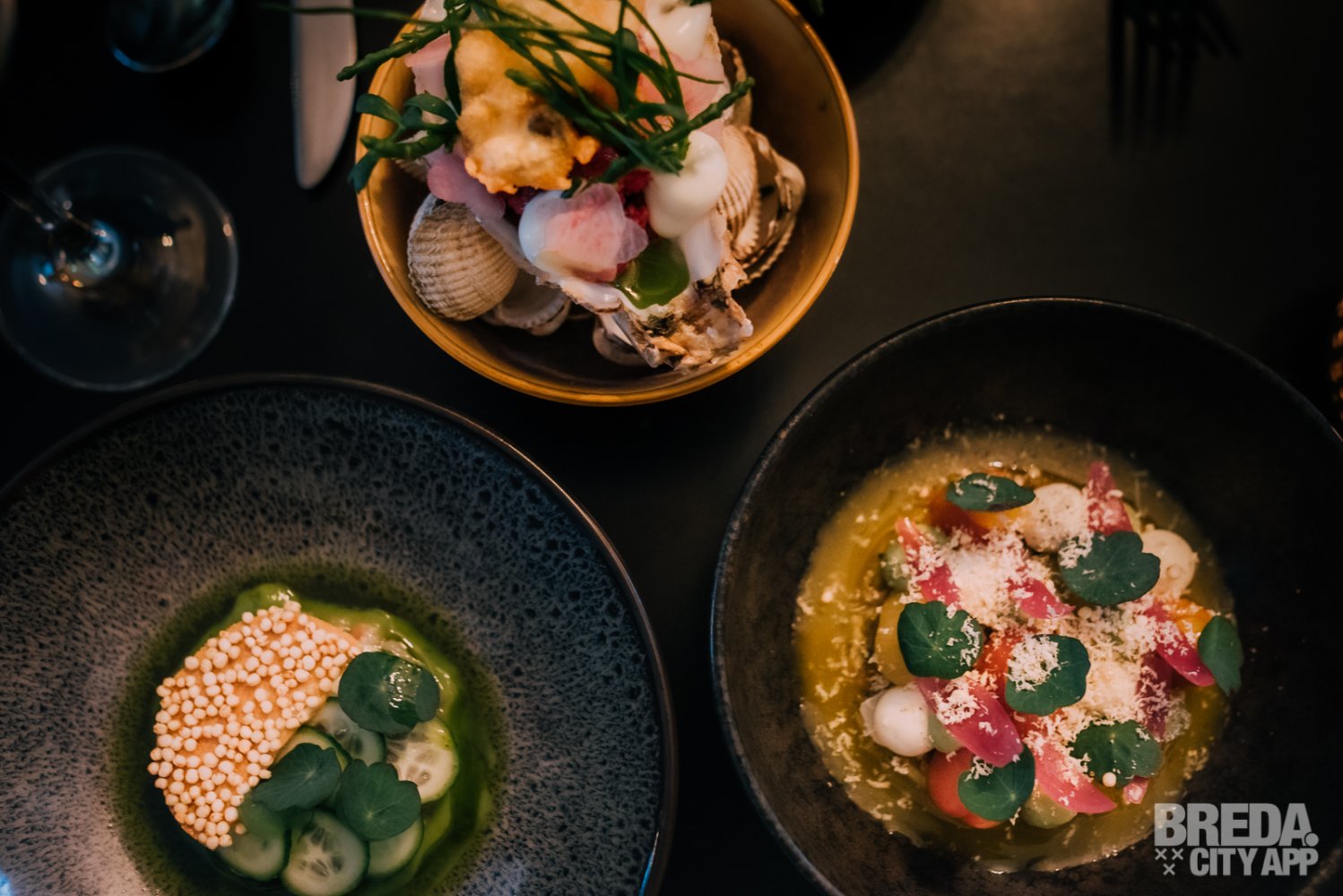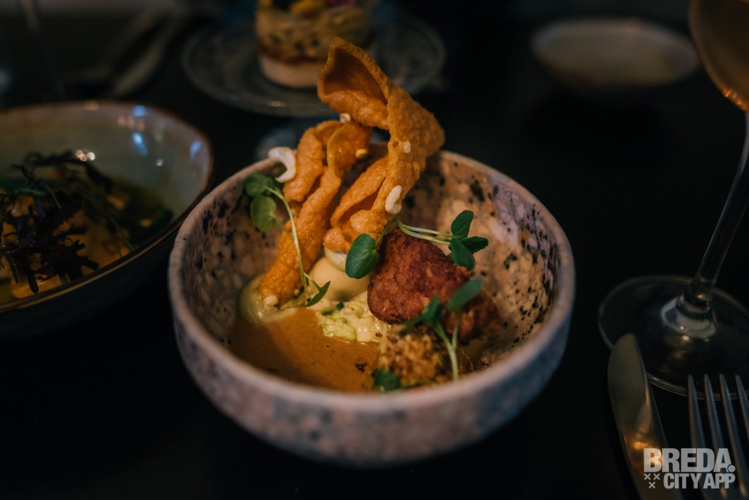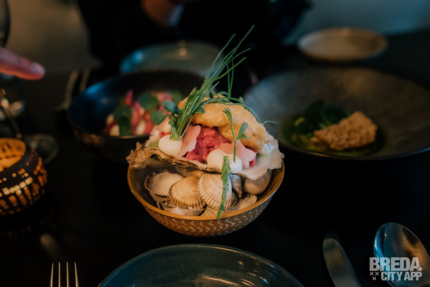 Vervolgens gaan we door met de bijzondere combinatie van gefrituurde oester met steak tartaar. Deze is afgetopt met knapperige zeegroenten, tom kha khai, radijs en een Thaise vinaigrette. Wij zijn positief verrast! Je proeft direct dat de oester ontzettend vers is. Het is een mooie combinatie van smaken waarbij pittig en zacht dichtbij elkaar komen. Het ziltige van de oester past perfect bij het frisse van het vlees.