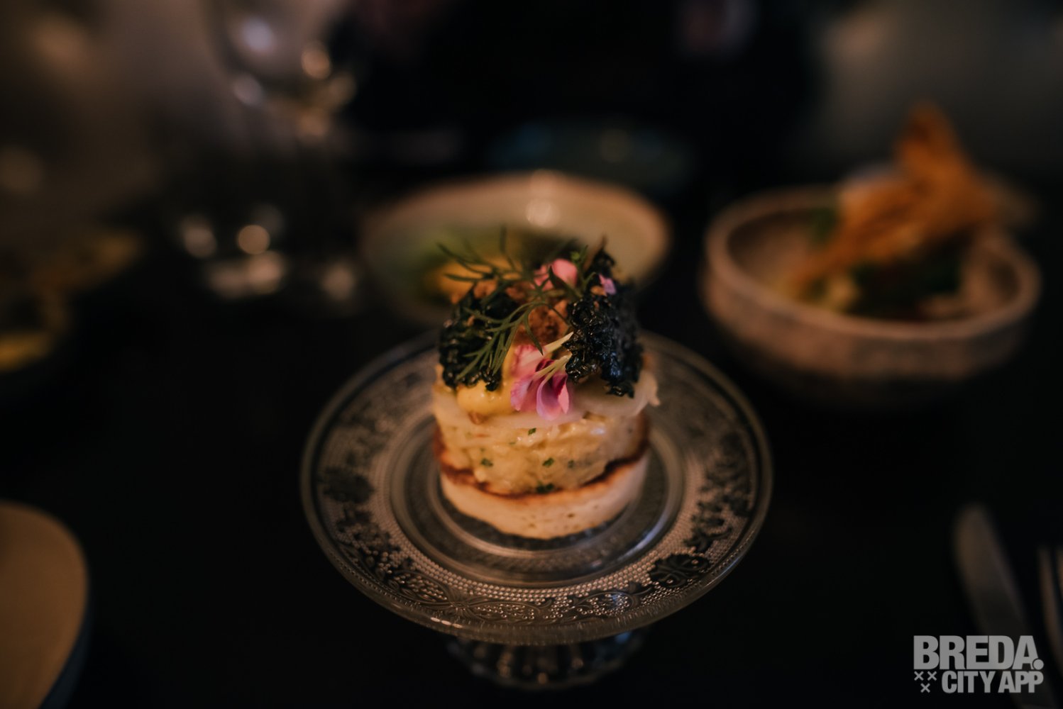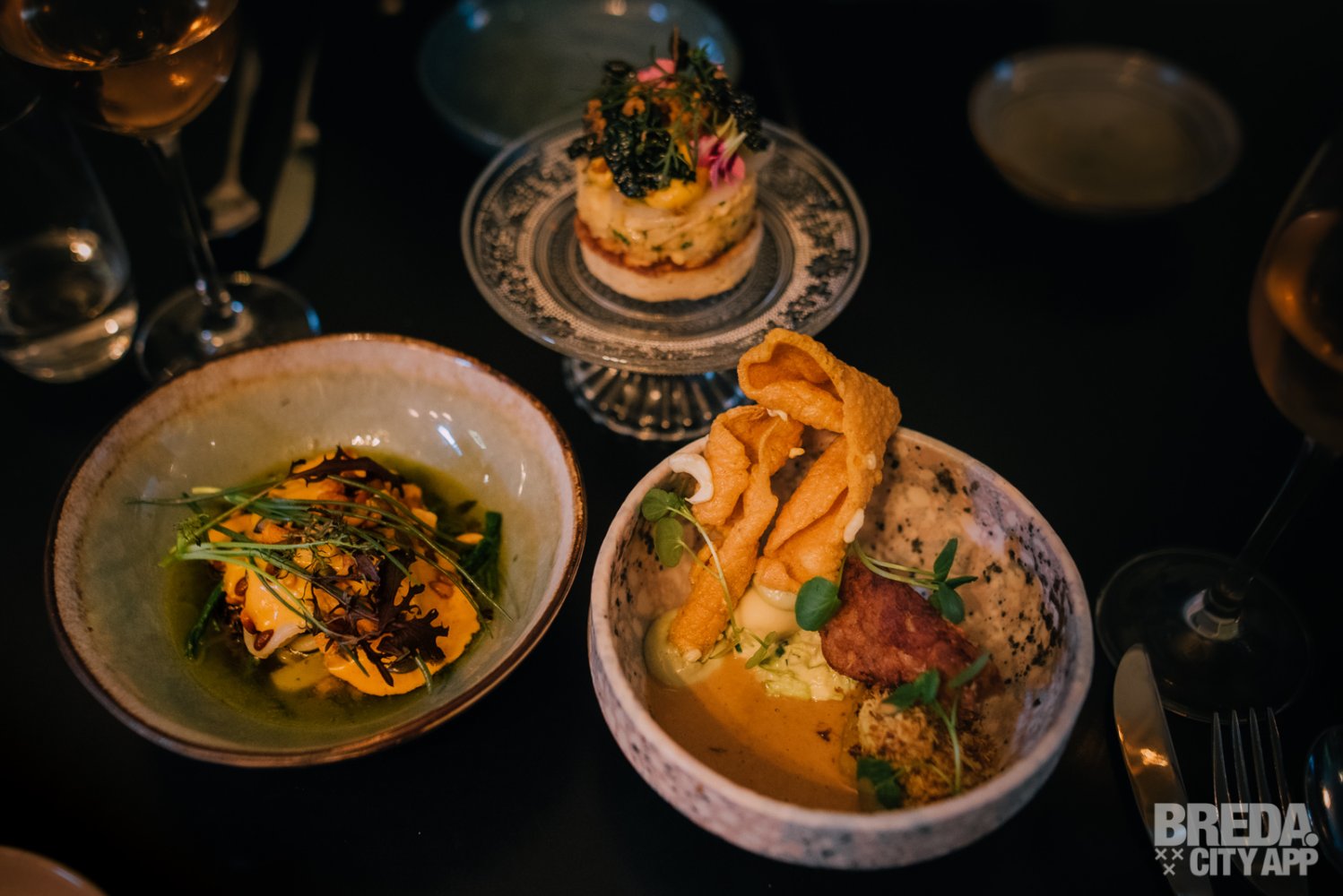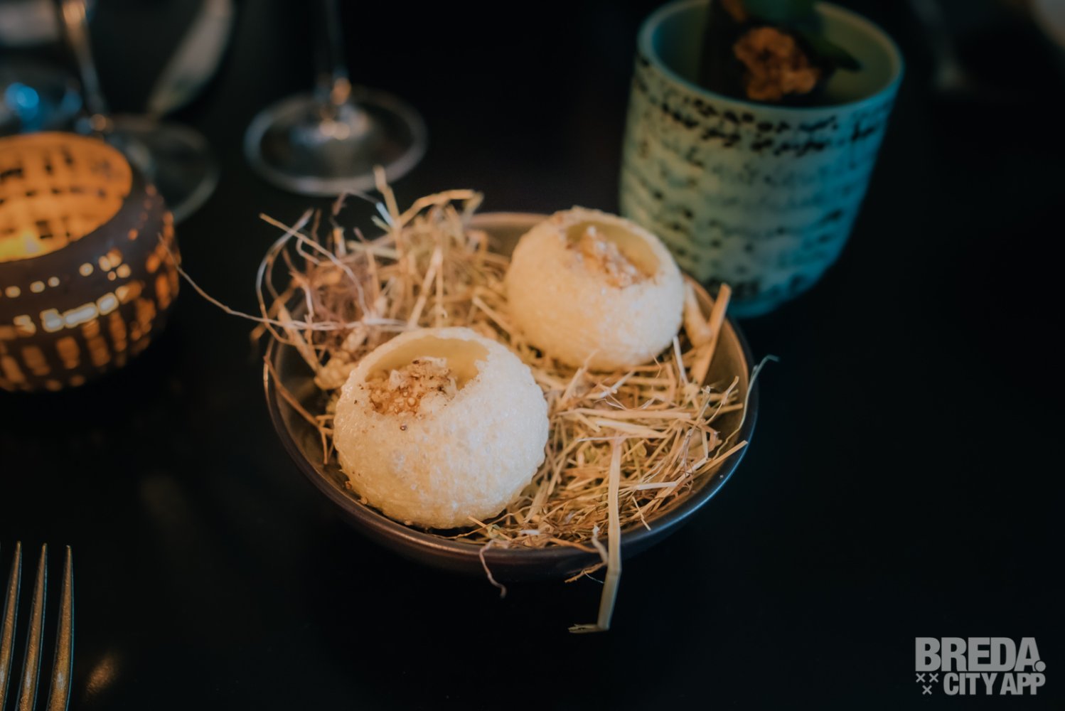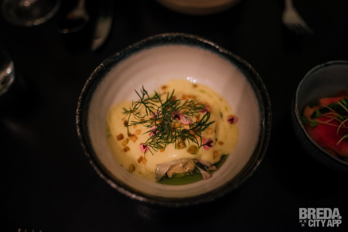 Wij kunnen niet anders zeggen dan dat we ont-zet-tend zitten te genieten. De eerste 6 gerechten vielen enorm in de smaak. Op naar de volgende ronde! We krijgen een heerlijk ruikende open ravioli gemaakt van knolselderij en paling met een espuma van oude kaas, verschillende structuren van aardappel en vulling van augurk. Daarna proeven we het gerecht bestaande uit rode biet en peer met schuim van aardappel, een mooie Brabantse blauwaderkaas en macadamia noten die zorgen voor een mooie bite. Eén van onze favorieten zover; deze combinatie is echt hemels!