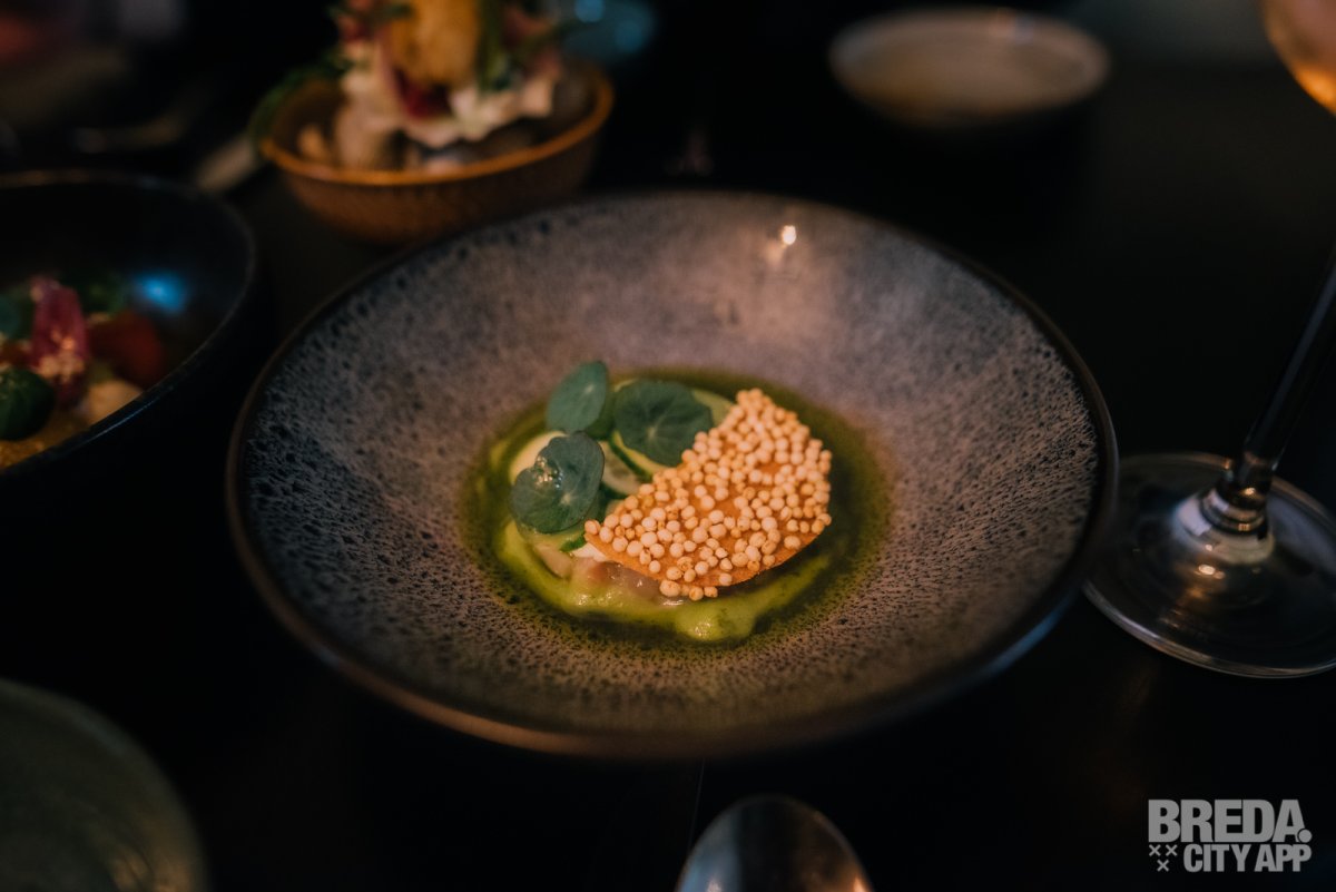 Het laatste gerecht dat we proeven in ronde 1 is de zeebaars. We verwachten dat het een heerlijk fris lentegerecht is en niets is minder waar! De tartaar van zeebaars ligt in gazpacho van jalapeño en avocado met daar bovenop kleine schijfjes mini komkommer én een krokantje van quinoa. De smaken zijn ontzettend goed in balans en de olie van koriander is super lekker in combinatie met de toegankelijke gazpacho.