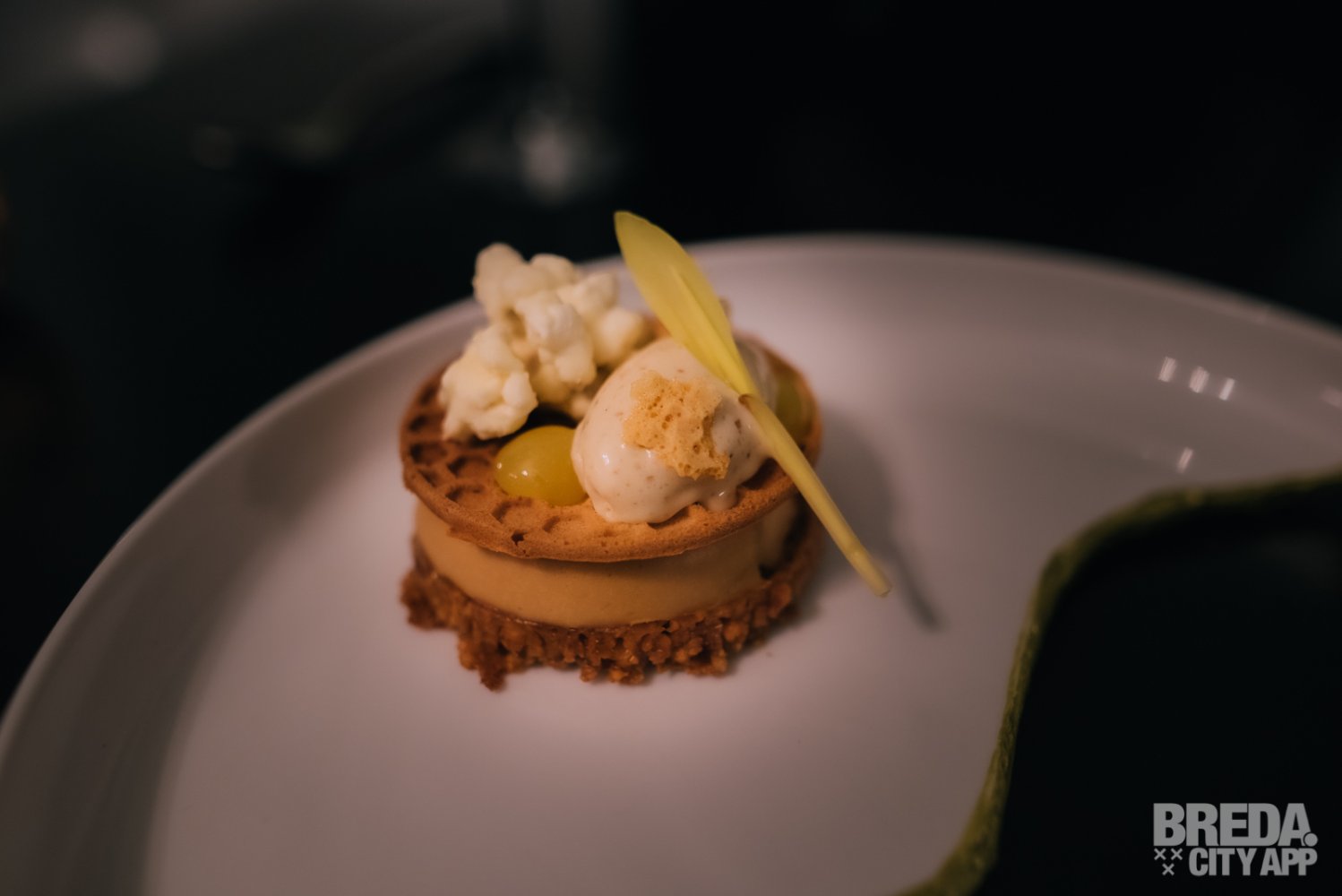 Bij het dessert zien we op de menukaart staan dat het bestaat uit een half dessert. We zijn erg benieuwd wat dat ons gaat brengen. Niet veel later komt er een mooi opgemaakt half bord op vanwege het 12,5 jarig bestaan. Dit dessert bestaat uit een honing noten taartje met een mouse gemaakt van miso en butterscotch. Geserveerd met popcorn ijs en een gel van citroen. Popcorn ijs? Ja zeker! En lekker dat het is, het is bijna niet van echte popcorn te onderscheiden.