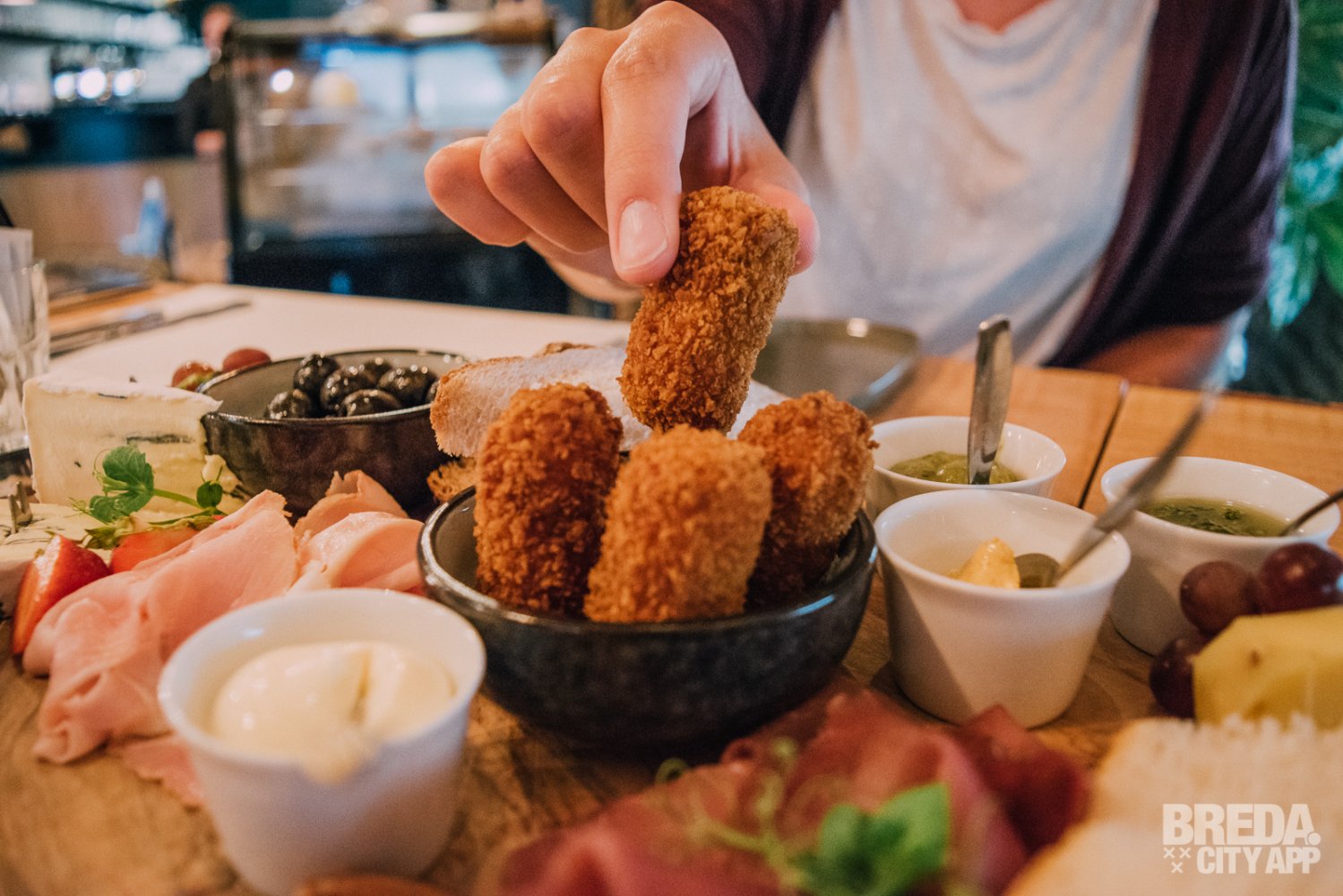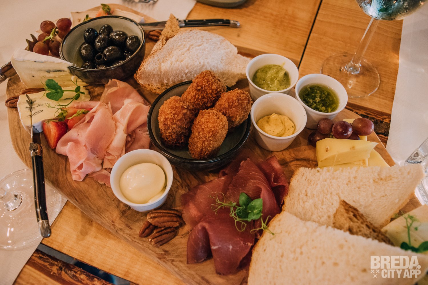 Bij het aperitief wordt de Bourgondisch Bavel Borrelplank geserveerd. Een heerlijke volle plank met Molenbrood met huisgemaakte salsa verde, kruidenboter en een spinazie-courgette dip, Italiaans gedroogd rundvlees en beenham, verschillende kazen uit Nederland, Frankrijk en Duitsland en chorizokroketjes met mayonaise. De plank is aangekleed met aardbeien, pecannoten en druiven. Leuk om te weten is dat het Molenbrood vers wordt gemaakt van het meel uit de eigen molen.