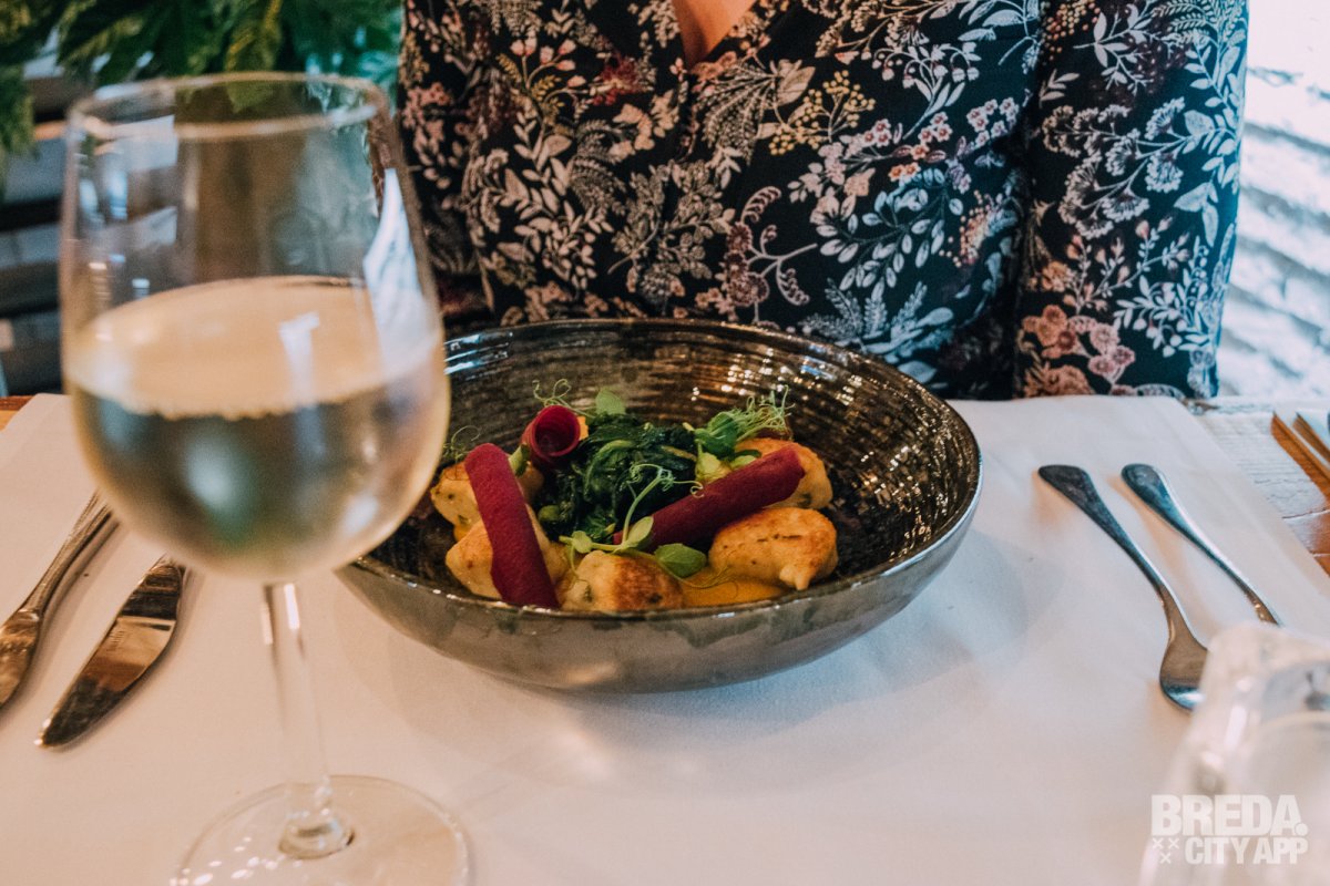 Vervolgens een ricotta met dumplings, aangekleed met rode biet, spinazie en een smaakvolle, licht pittige pompoenpuree. Daarna proeven wij de Black Tiger garnalen (ja, ze zijn gepeld!) gebakken in knoflook-chili en gremolata. Heerlijk om er nog een stukje brood doorheen te halen.