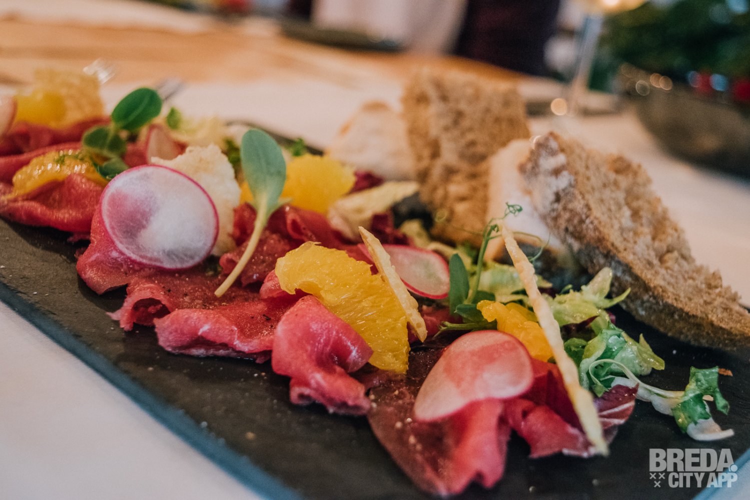 En als laatste een rundercarpaccio met sinaasappel, kletskop van Parmezaan en kruidenolie. Een verrassend lekkere combinatie.