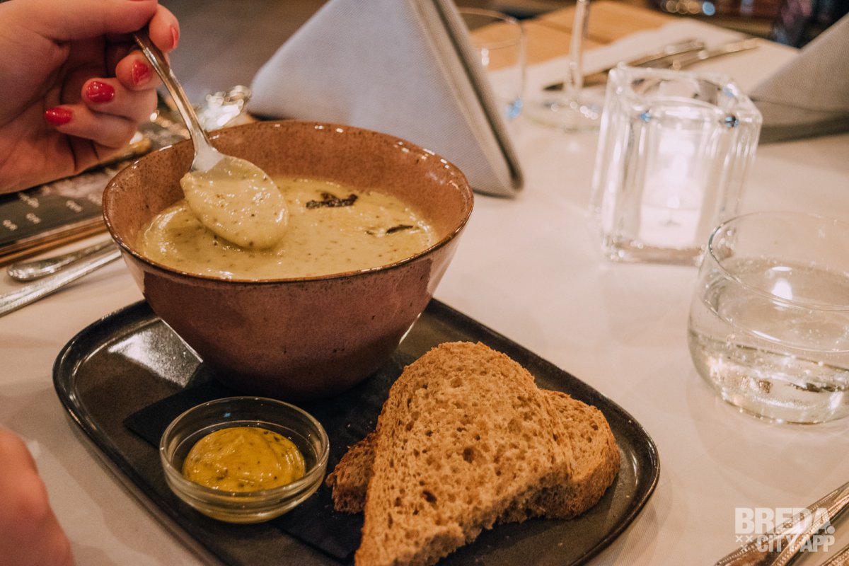 Wanneer de voorgerechten op tafel worden gezet is het al een feestje voor het oog. De borden zijn mooi opgemaakt en de gerechten zien er heerlijk uit. Wij hebben besloten om allemaal een ander gerecht te nemen, zodat wij alles kunnen proeven. Om te beginnen proeven wij een heerlijke huisgemaakte mosterdsoep met spek en Molenbrood.