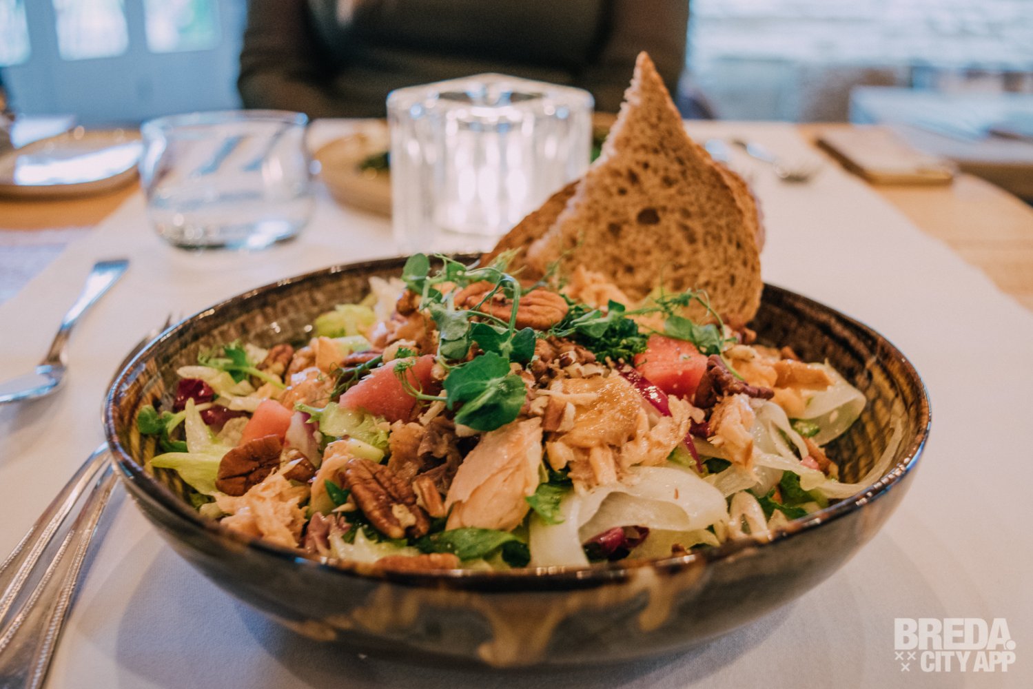 En als laatste proeven wij salade De Hoop. Een frisse salade met watermeloen, feta, pecannoten, zoetzure venkel, citrus vinaigrette en huis gerookte zalm. De zalm is perfect gerookt en zacht van smaak, een echte aanrader!