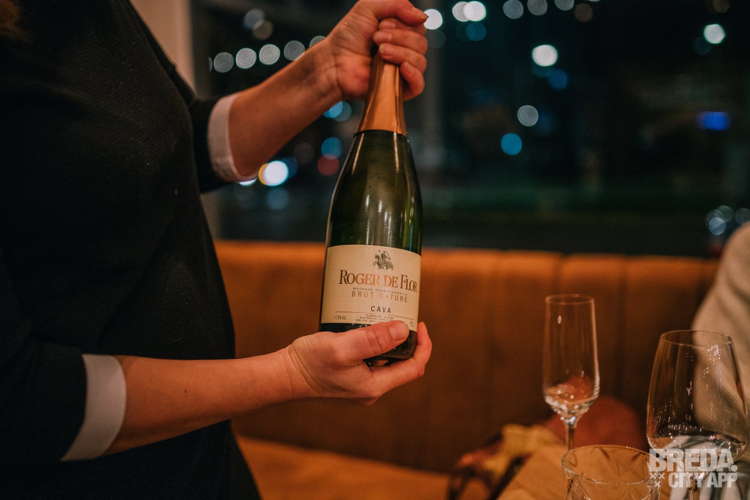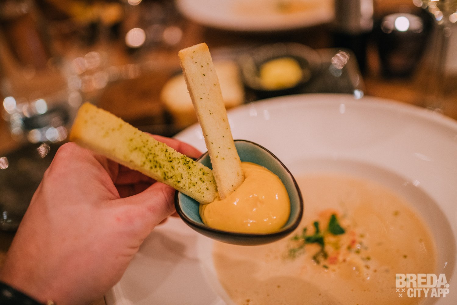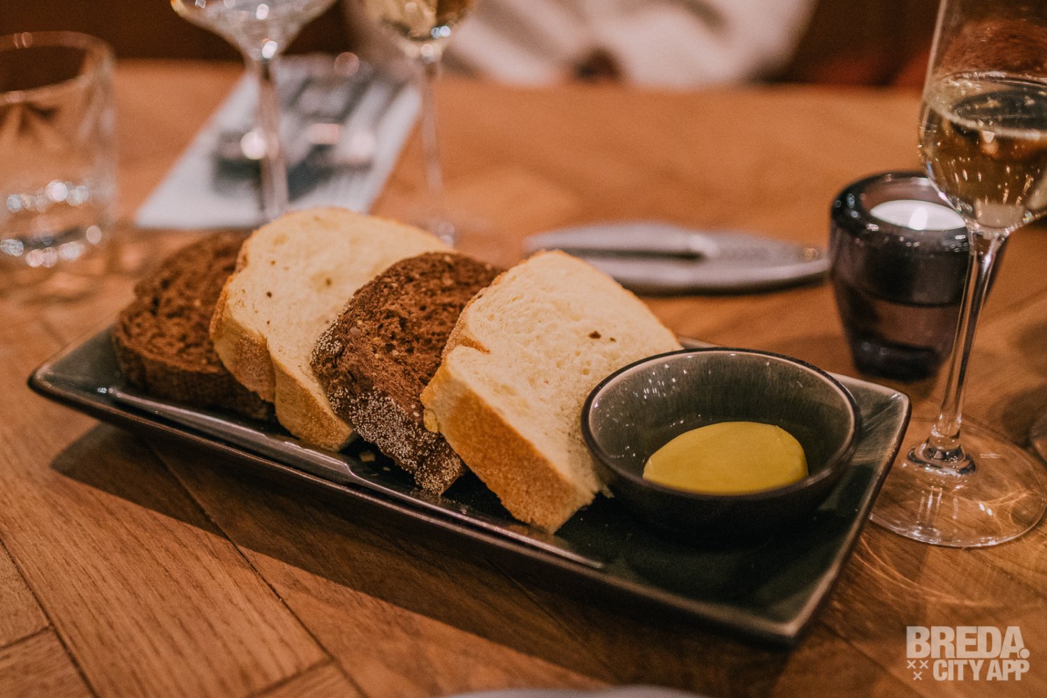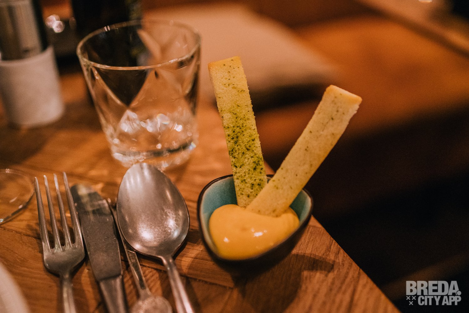 Op aanraden van Sahila starten we als aperitief met een cava van Roger de Flor. Deze mousserende wijn heeft een licht zoetje met een frisse afdronk. We krijgen hierbij een klein schaaltje met groente chips en iets later brood met boter en olijfolie. Het brood was nog warm en smaakte daardoor super vers.