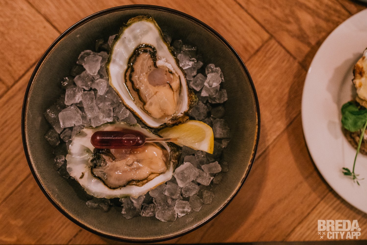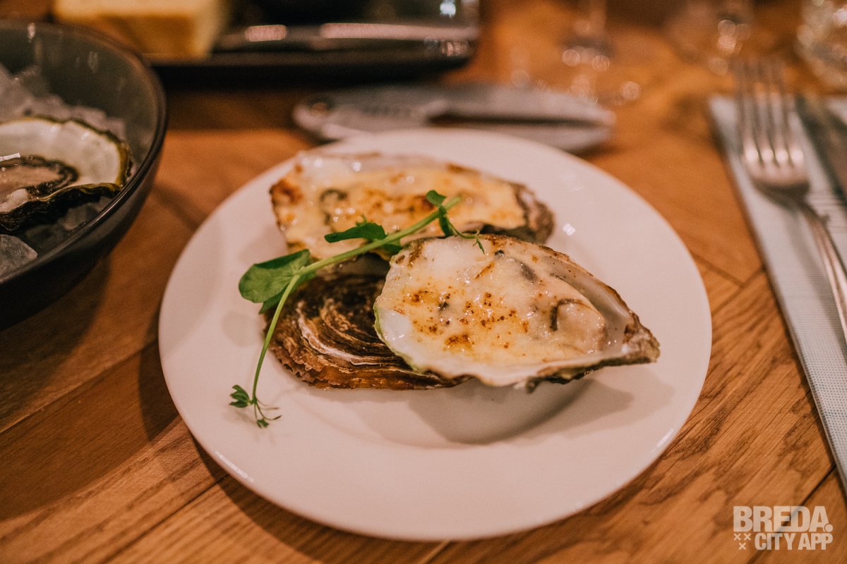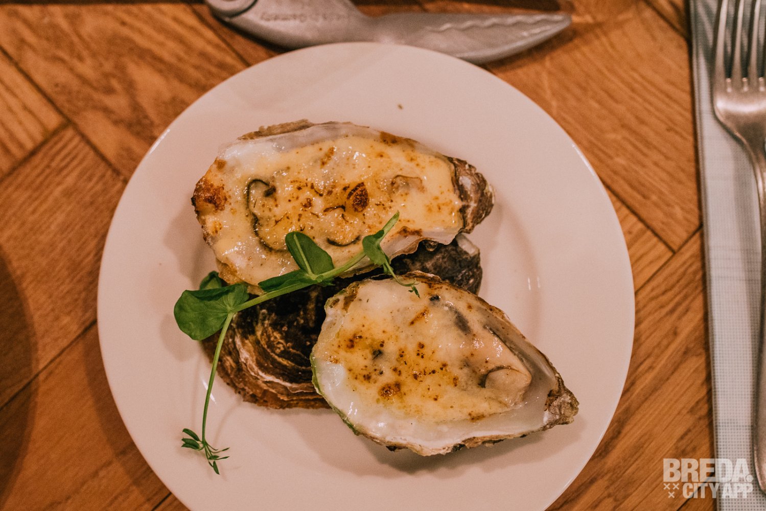 De gegratineerde oesters worden op een wit bordje geserveerd met een stukje garnering. De geur die er vanaf komt is verrukkelijk en de smaak is nog beter! De oesters zijn zacht gegaard en nog lekker mals. We proeven de ziltige smaak van de oester, welke mooi in balans is met de romige en volle smaak van de gratinering met Parmezaanse kaas.