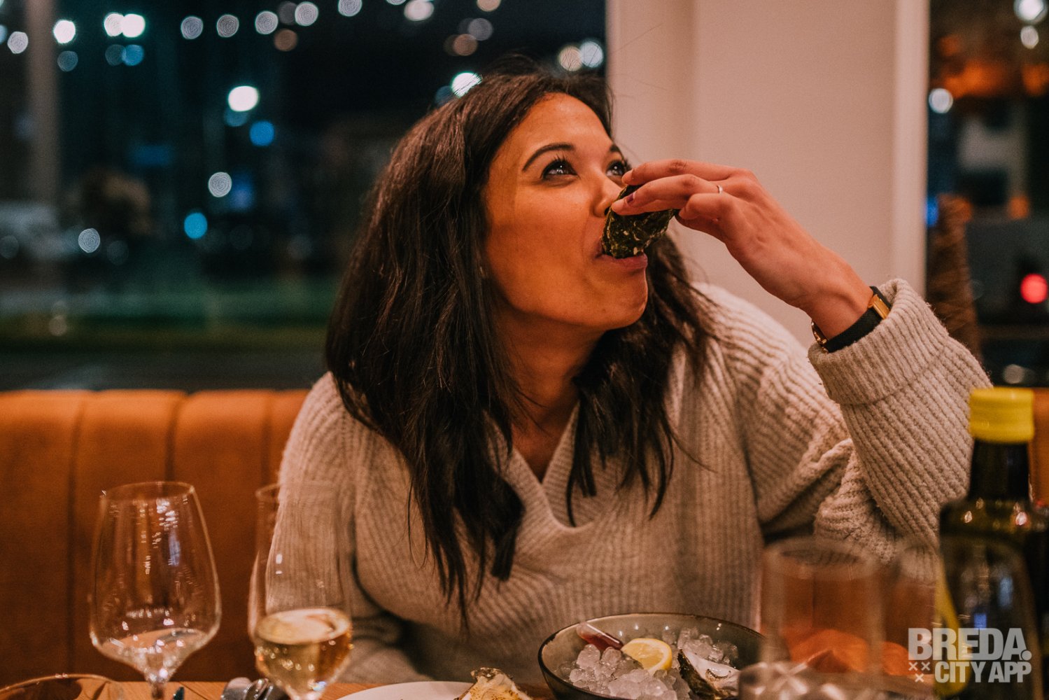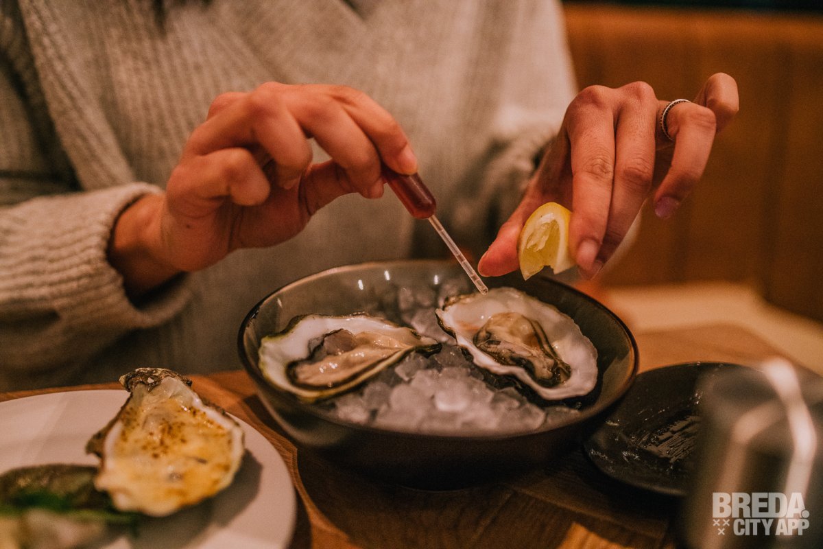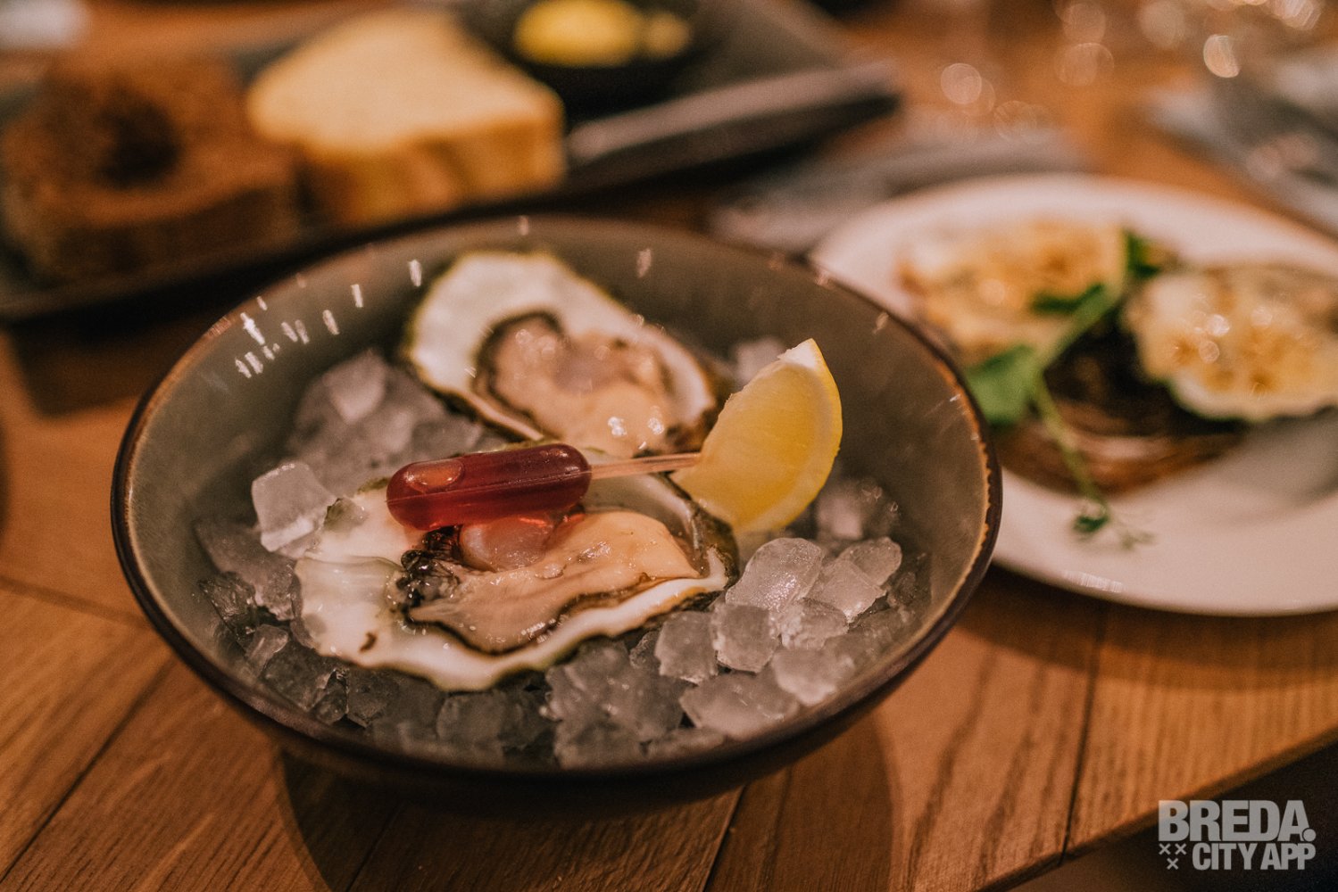 De gegratineerde oesters worden op een wit bordje geserveerd met een stukje garnering. De geur die er vanaf komt is verrukkelijk en de smaak is nog beter! De oesters zijn zacht gegaard en nog lekker mals. We proeven de ziltige smaak van de oester, welke mooi in balans is met de romige en volle smaak van de gratinering met Parmezaanse kaas.