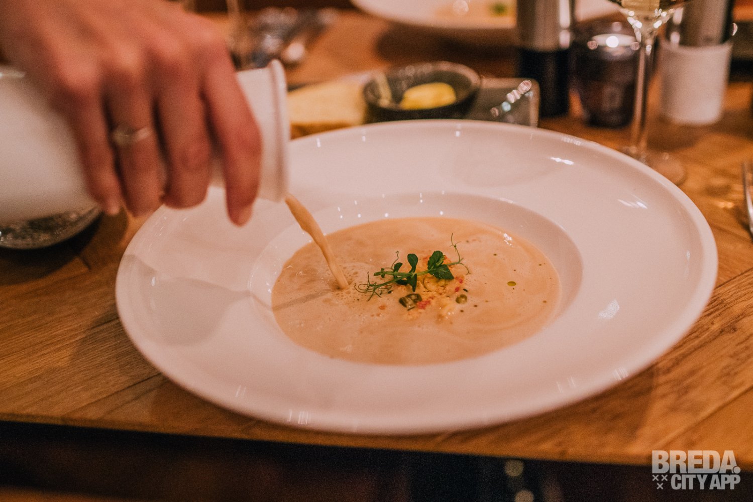 Als tussengerecht besluiten wij voor de huisgemaakt bisque te gaan, een gerecht waar de Veestallen nu al om bekend staan. De bisque wordt in een diep bord aan tafel ingeschonken met in het midden een tartaar gamba's en rivierkreeftjes, bieslookolie, chips van lotuswortel en een druppel room. De bisque is romig en rijk van smaak, absoluut een aanrader!