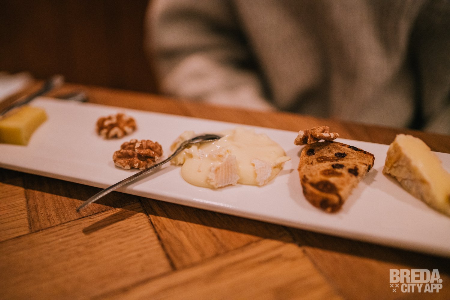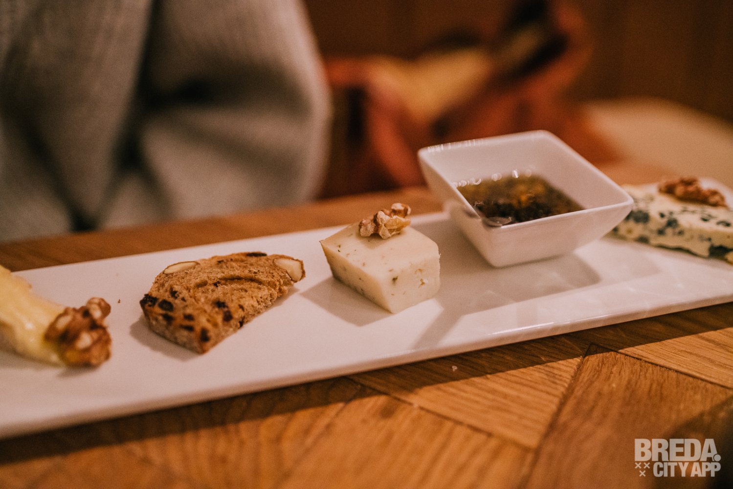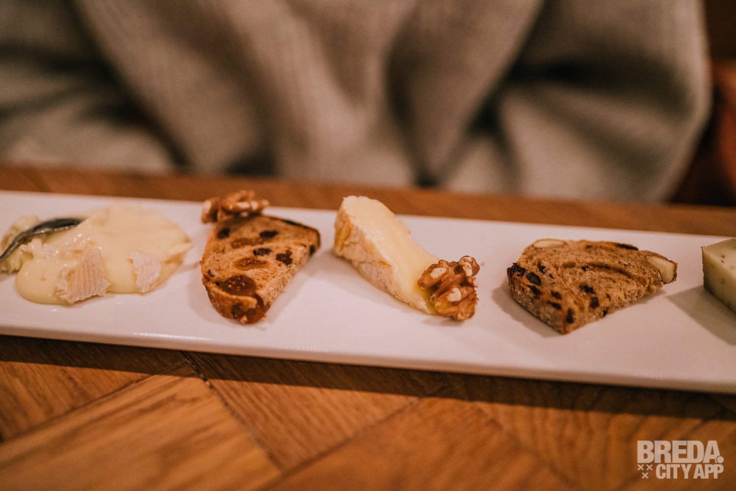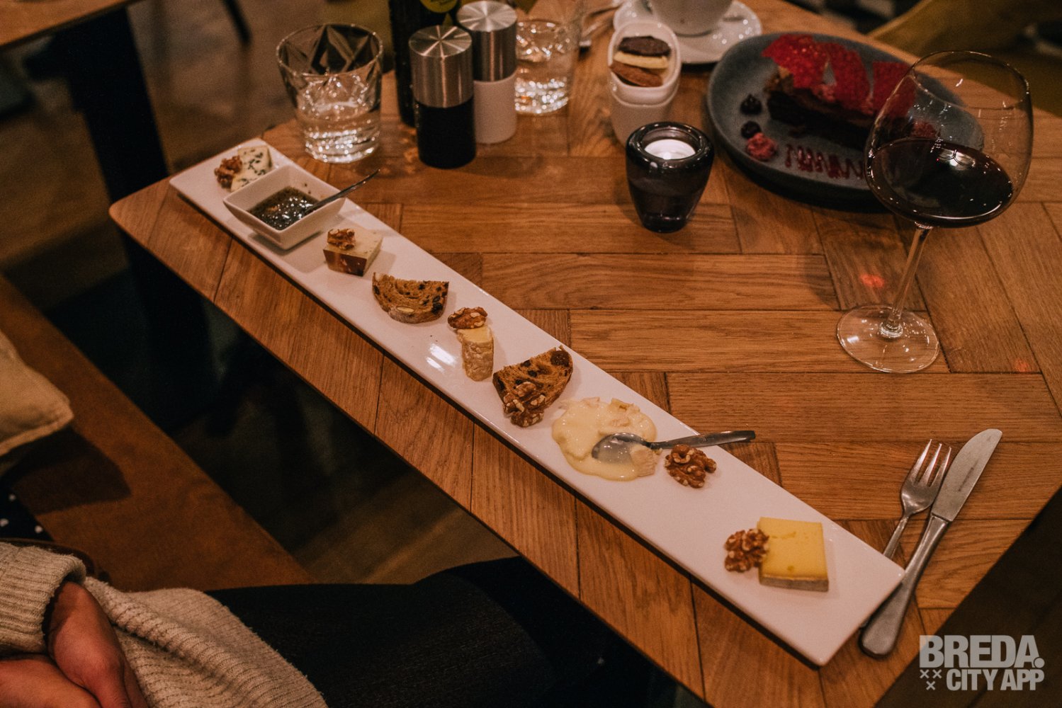 Voor het dessert kiezen we eerst de kaasplank van Hendrik & Marcella, een specialiteitenwinkel voor kaas aan het Valkeniersplein. We krijgen vijf kazen, welke op een langwerpig bord worden gepresenteerd: