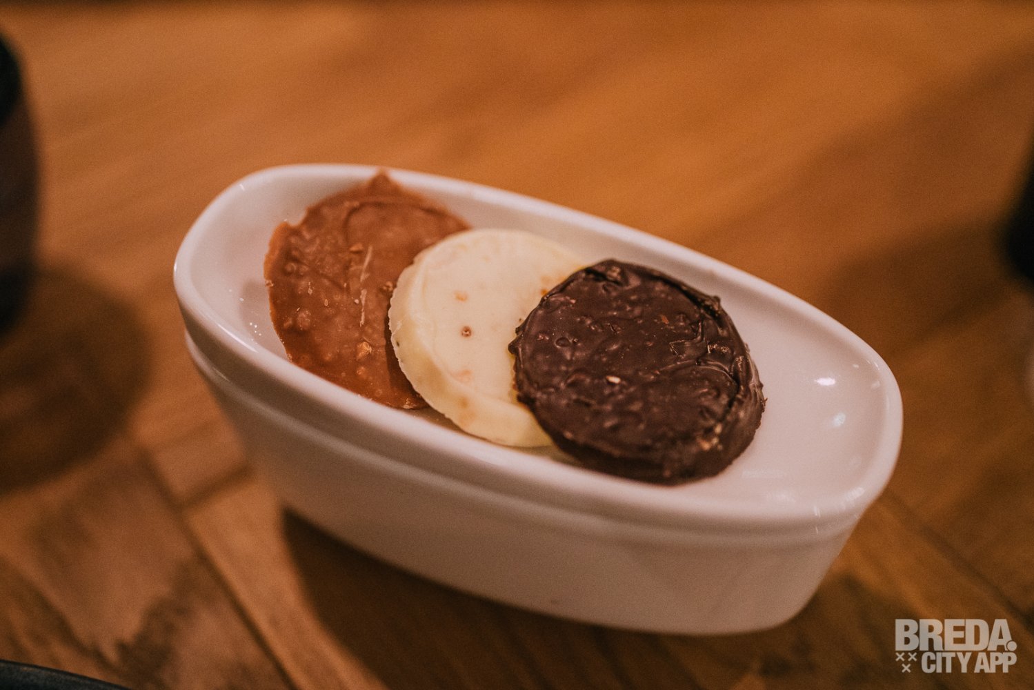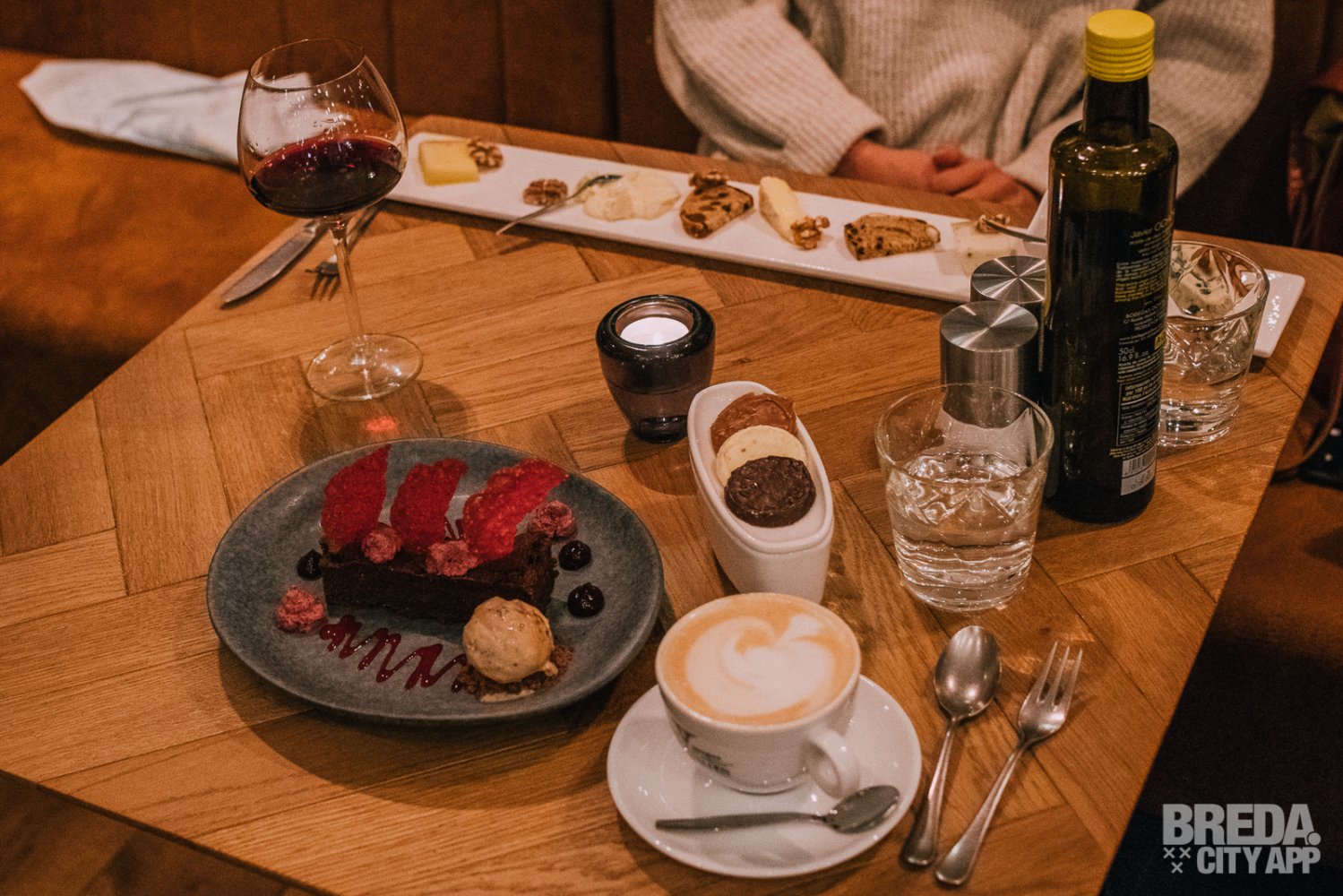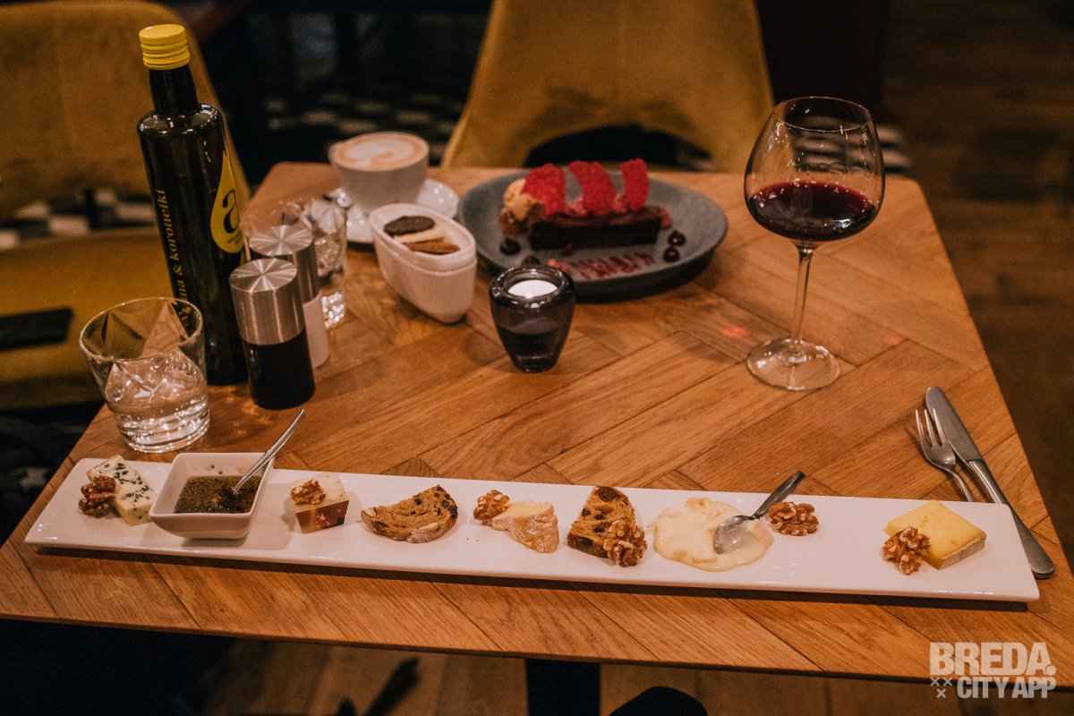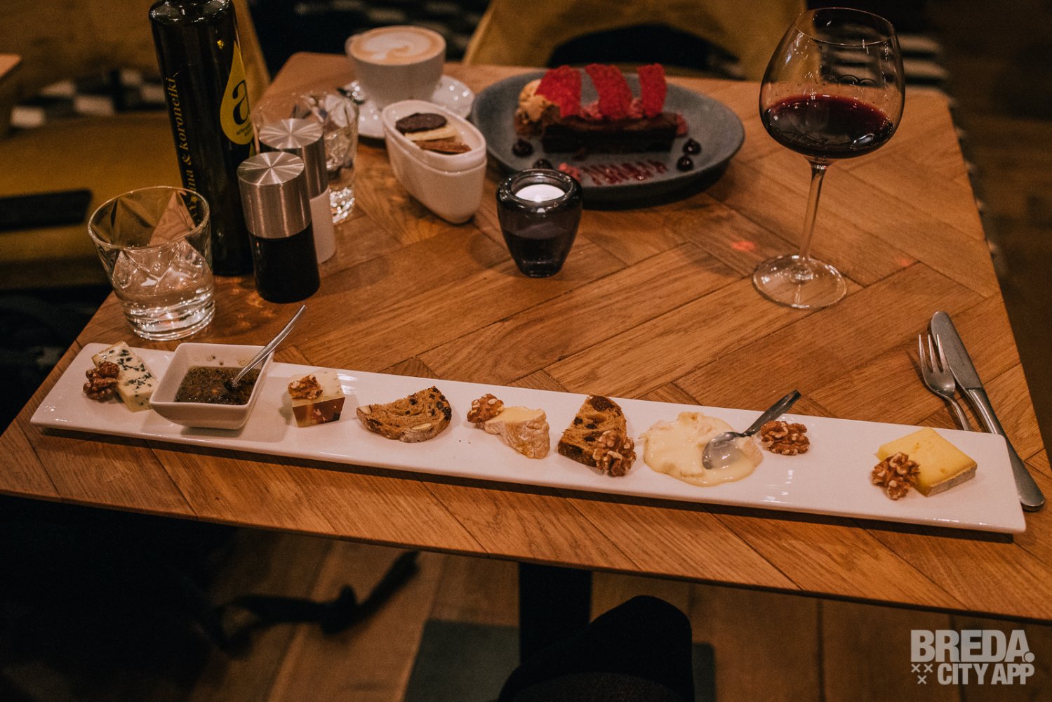 Voor het dessert kiezen we eerst de kaasplank van Hendrik & Marcella, een specialiteitenwinkel voor kaas aan het Valkeniersplein. We krijgen vijf kazen, welke op een langwerpig bord worden gepresenteerd: