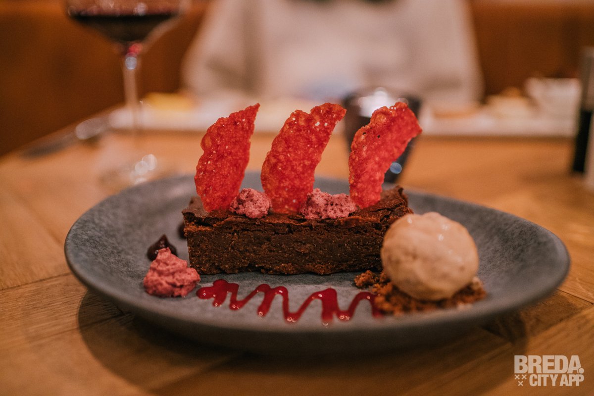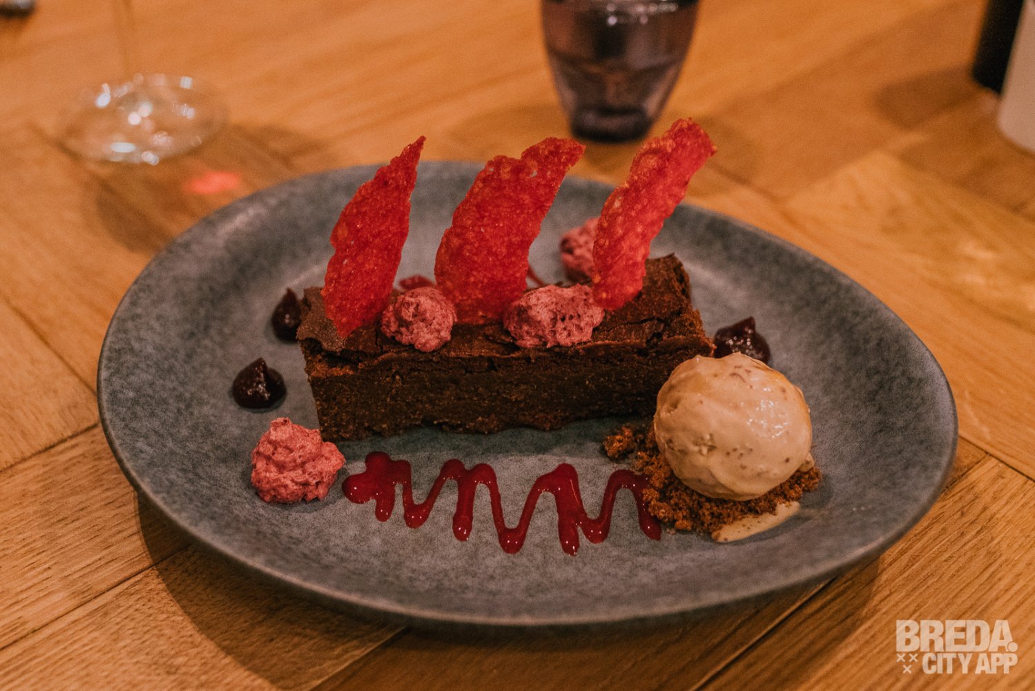 Hou jij meer van een chocolade dessert? Dan is de chocolade savarin iets voor jou! De savarin wordt geserveerd met amarene gel, amarene mousse, kletskoppen, chocolade crumble en een bolletje ijs van caramel-zeezout. De savarin is smeuïg en heeft een verfijnde chocoladesmaak, de mouse en gel van amarene zorgen voor een frisse toevoeging aan het dessert. Een heerlijk dessert en een riante portie.