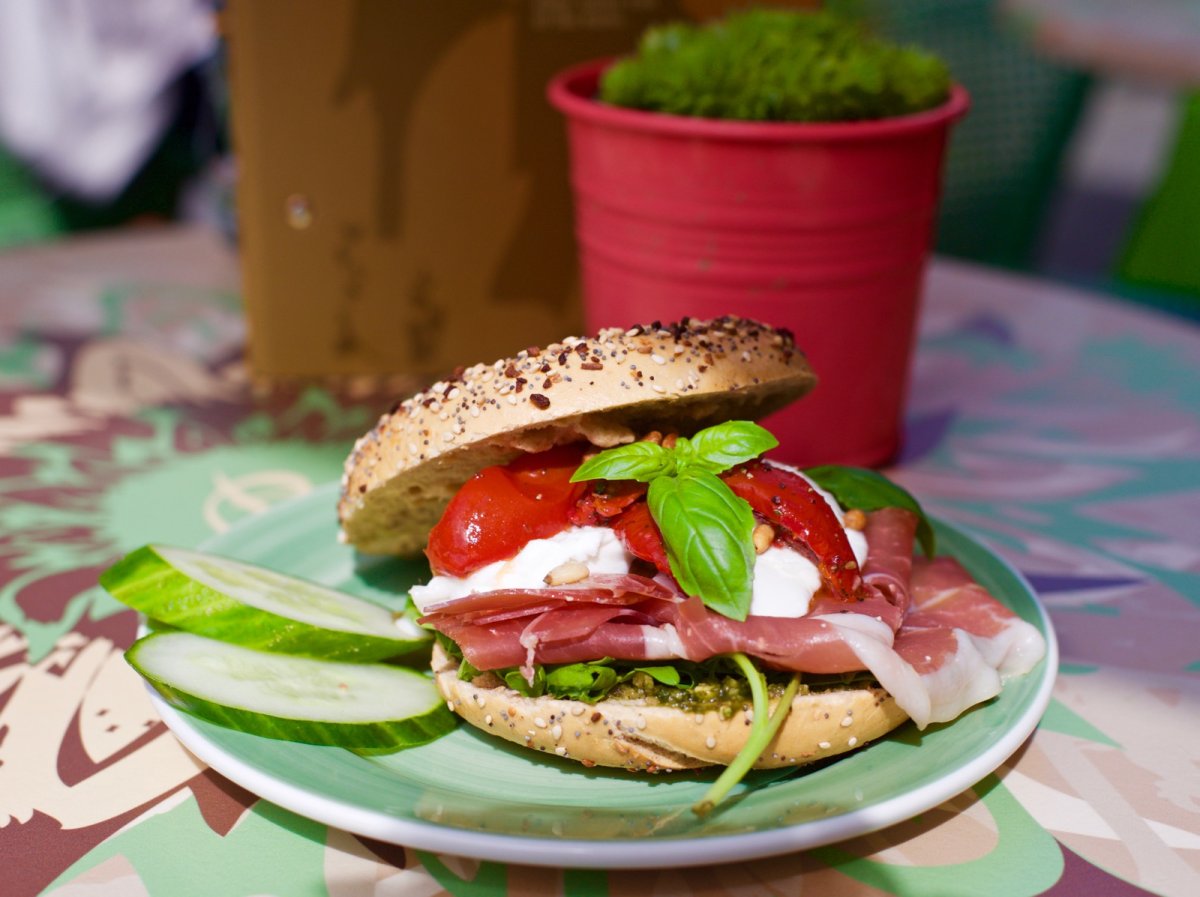 De Parmabella is een bagels met buffel mozzarella, prociutto di monastero (livar kloosterham), zontomaatjes, pesto, pijnboompitjes en rucola. Deze bagels is absoluut een van mijn favorieten. De bagel is rijkelijk belegd en alle ingrediënten zijn super vers. De buffel mozzarella smelt op je tong en wordt mooi gecomplimenteerd door het zoutje van de ham en volle smaak van de pesto. Heerlijk!