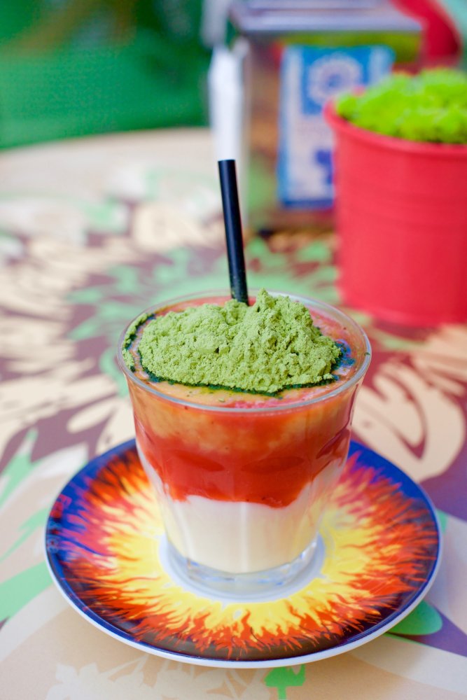 Om te beginnen besloten we de biologische yoghurt met  aardbei-, bananensap en tarwegras-poeder te proberen. Een kleurrijk gerechtje en super lekker! Het groene poeder meng je door de yoghurt heen. De smaak is moeilijk te beschrijven, maar wij vonden deze combi erg goed.