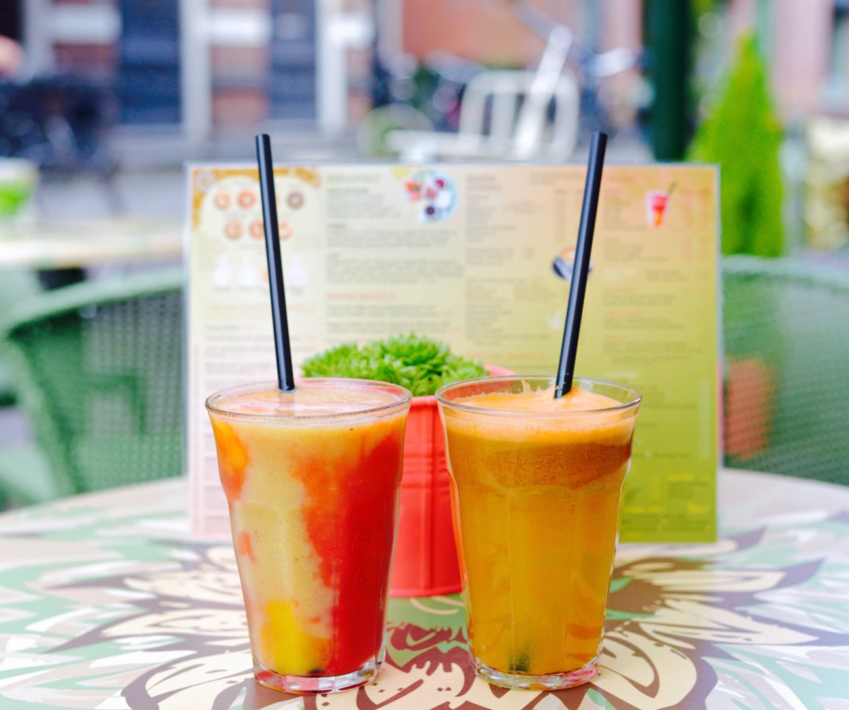 Bagels & Beans heeft verschillende verse sappen op de kaart staan. Vandaag bestelden we twee sapjes: "alles gemixt" en "wortel, appel en komkommer". Vers,  gezond en super lekker!