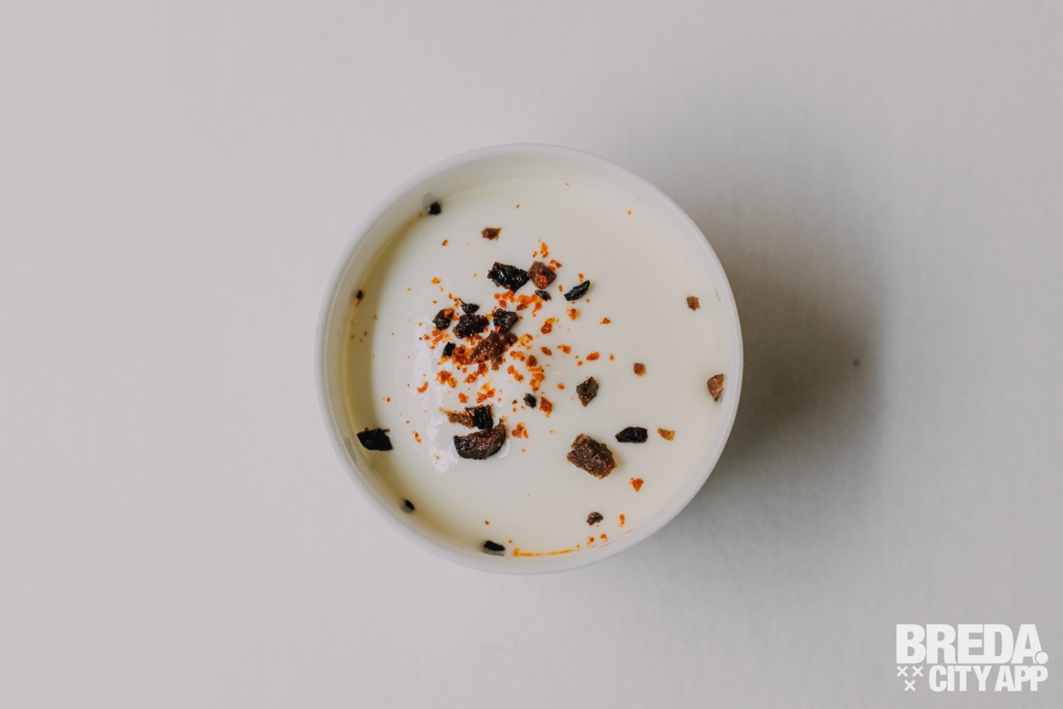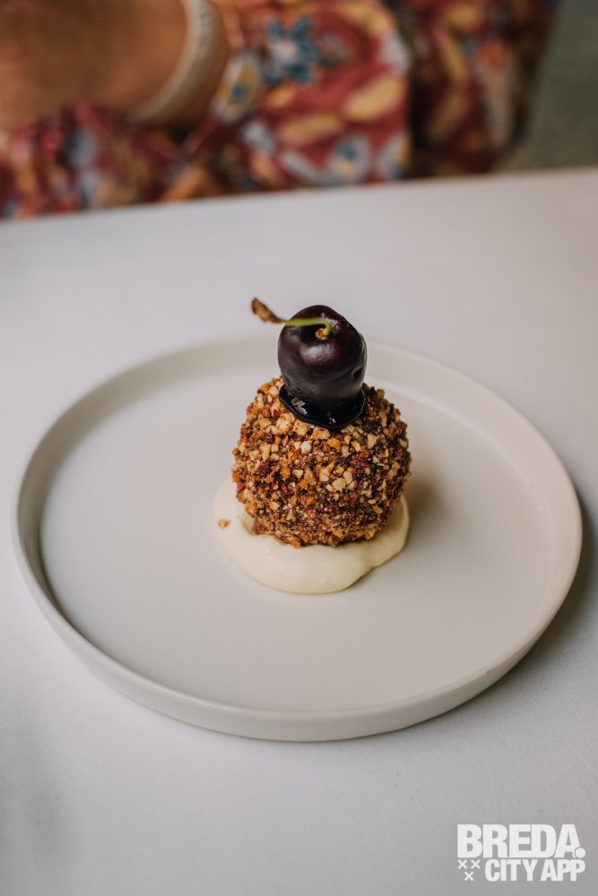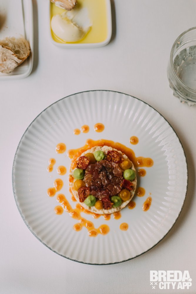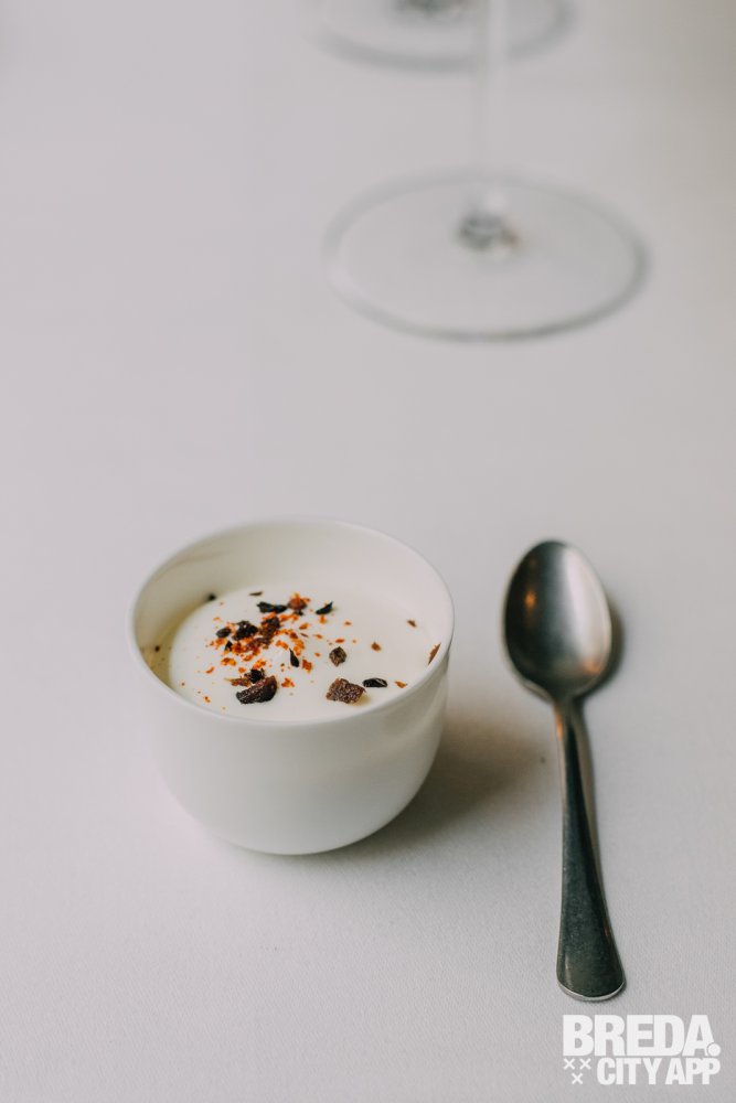 De amuse is een verfijnde traktatie van romige burrata mousse, weelderig bedekt met gedroogde olijven en geserveerd met een smaakvolle combinatie van aubergine & tomaat.