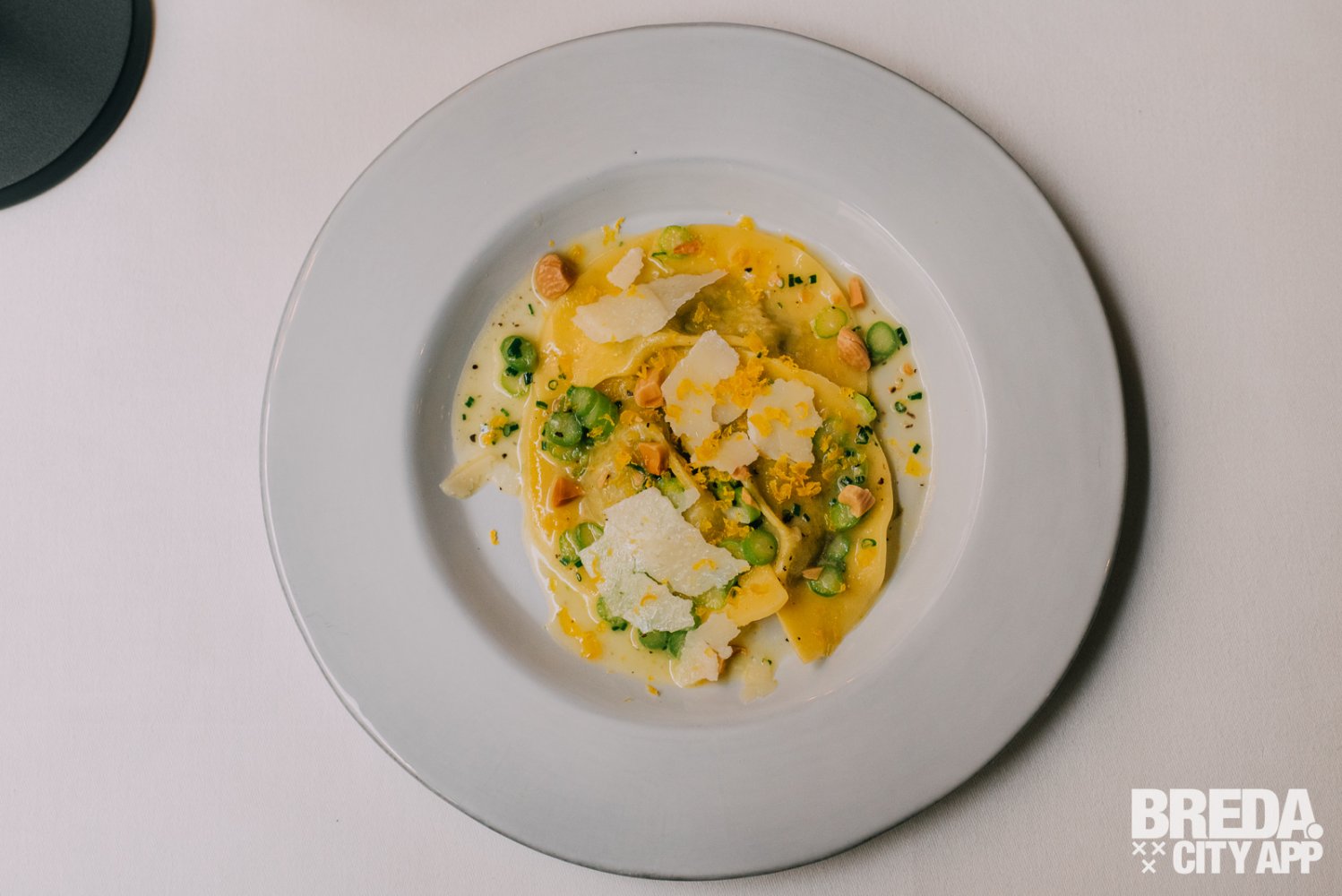 Bij dit gerecht schenken ze een Lugana Cesari Cent Filaria, gemaakt van Turbiana en Chardonnay druiven uit het mooie Lugana-gebied aan de zuidelijke oevers van het Gardameer. Deze frisse, fruitige en bloemige wijn is een ware veelzijdige smaakbeleving. Daarnaast het gerecht Mezzaluna, een heerlijke ravioli gevuld met groene asperge en Pecorino, gekroond met een knapperige amandel en geraspte ei. Een culinair gerecht dat perfect samensmelt met de Lugana-wijn.