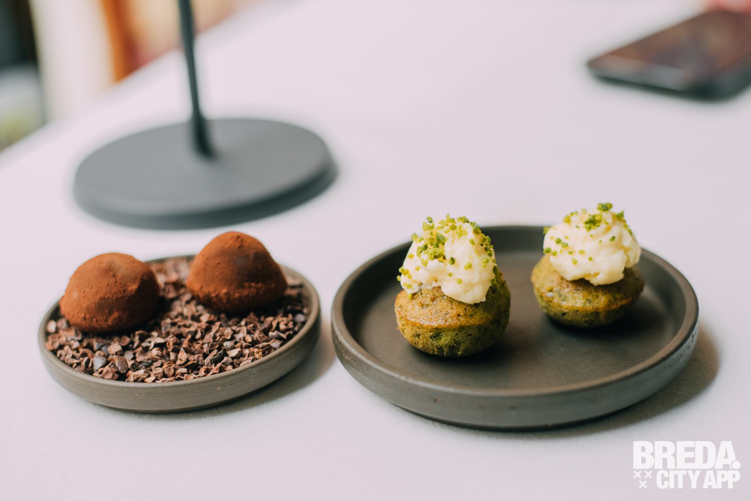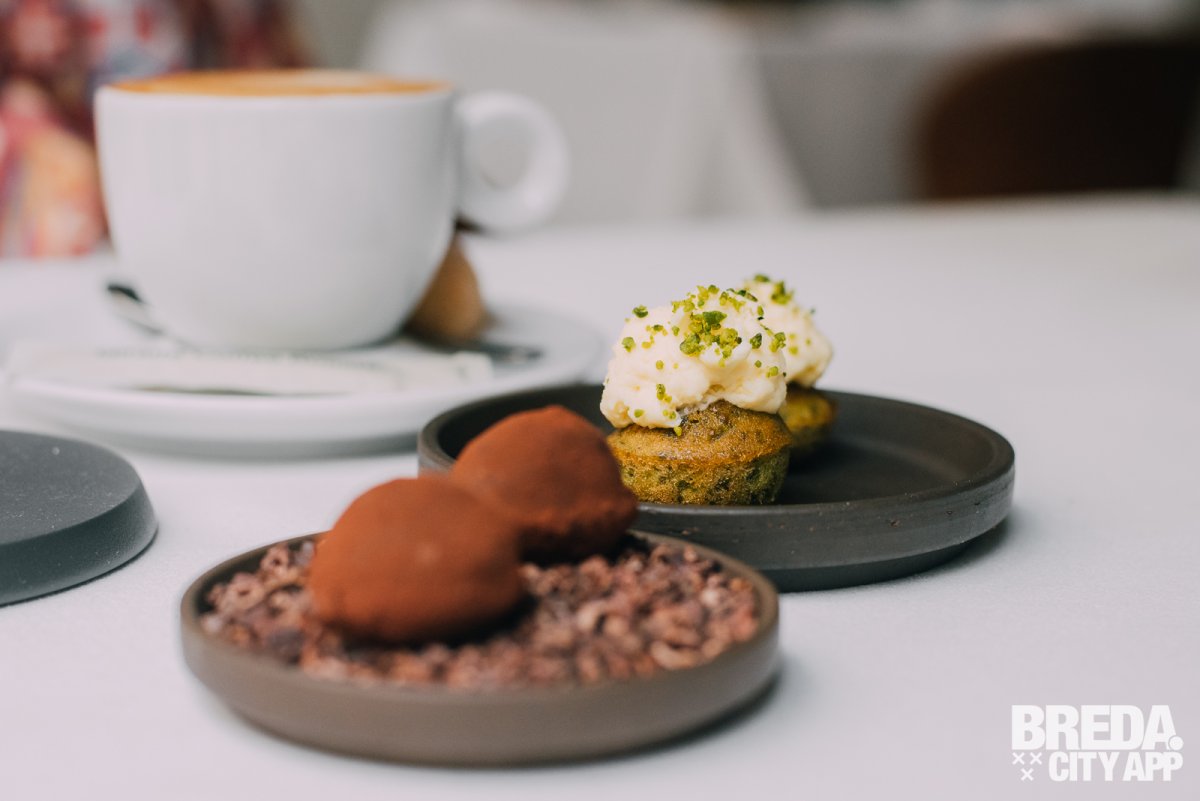 We ontvangen nog een heerlijke cappuccino met verleidelijke friandises van truffel, daarnaast een betoverende pistachecake met een frisse citroencrème. Een zalige traktatie die je smaakpapillen streelt met de zachte textuur van de crème.