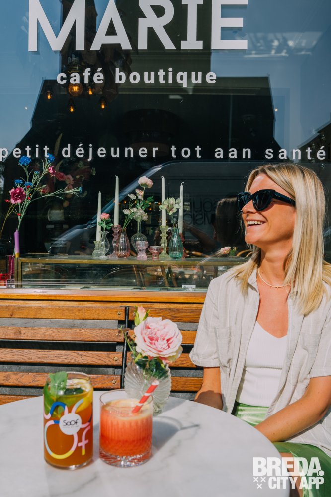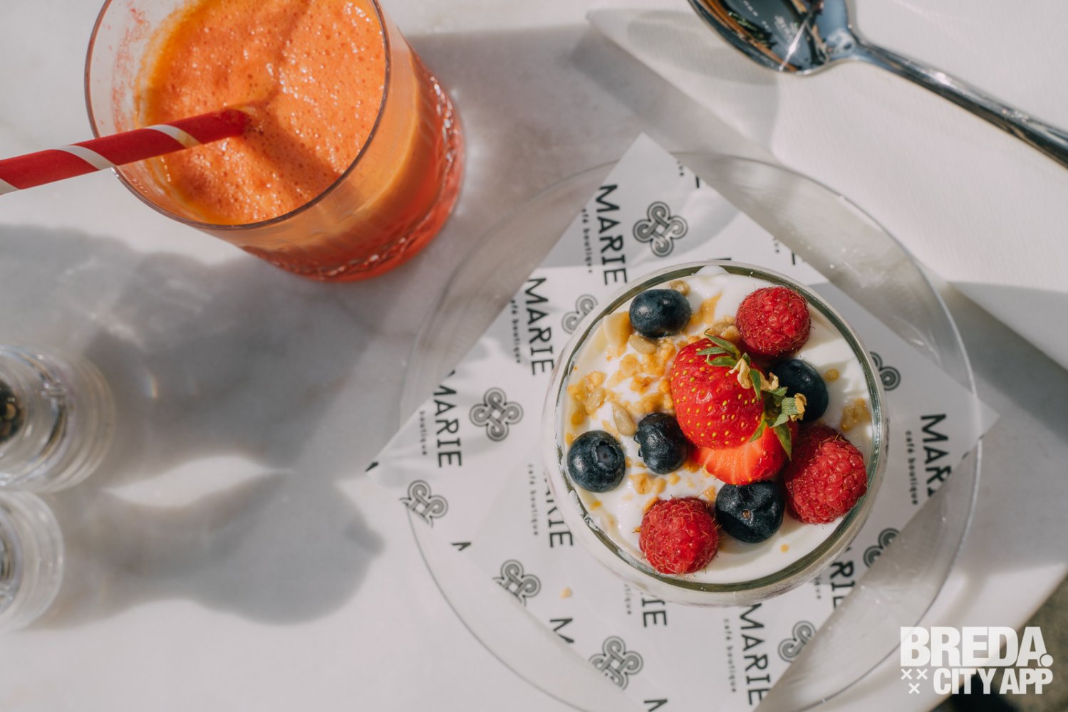Het is 09:00 uur en bij MARIE staat de deur al open. 's Ochtends wordt hier gezellig koffie gedronken en zit men heerlijk te genieten van de eerste zonnestralen. Het bankje buiten leent zich er goed voor om wakker te worden met een kopje koffie en een vers croissantje. Aardbeienjam en gezouten boter erbij? Ja hoor, lekker! We nemen er direct een verse sap naast om de dorst mee te lessen. Dit keer wordt het een verse jus d'orange met aardbeien. Fris en een beetje zoet, altijd goed! Mocht je meer fan zijn van een pure jus d'orange of juist een kiwi of appel er doorheen willen? Vraag het MARIE en het wordt geregeld.