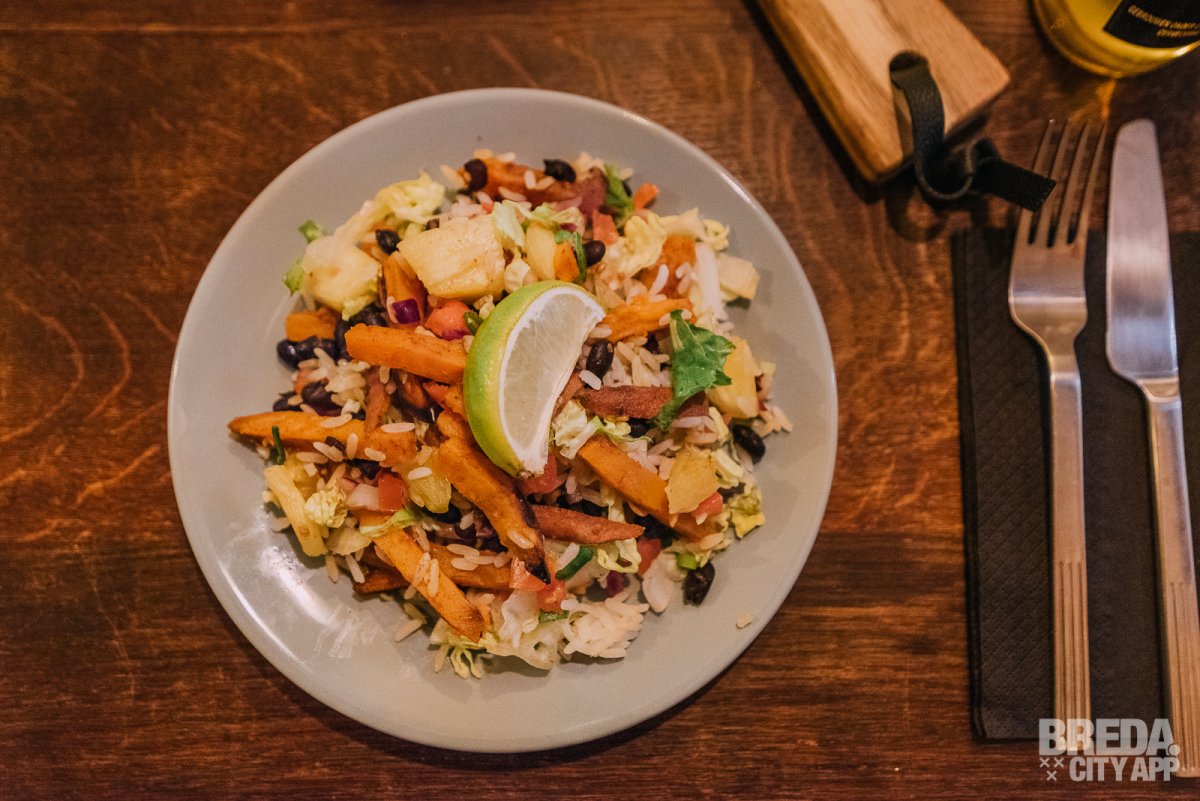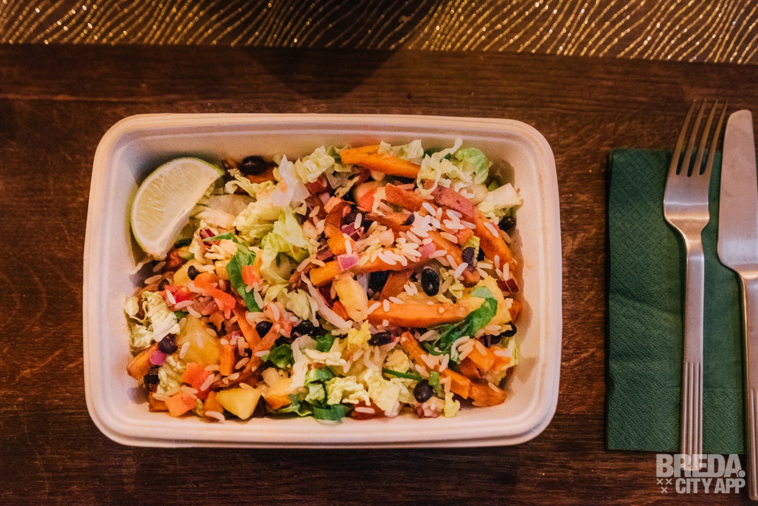 Eenmaal thuis halen we al watertandend het heerlijk geurende eten uit de zak en maken we er een mooi bordje en plankje van. Ik begin met de goed gevulde salade van witte rijst, zwarte bonen, zoete aardappel, ananas, sla, geroosterde groenten, lente-ui en tomatensalsa. Het bijgevoegde limoentje knijp ik over de salade heen uit, wat zorgt voor een friszure touch. Een verrassende en heerlijke combinatie van hartig en zoet die ook erg geschikt is voor vegetariërs en veganisten.