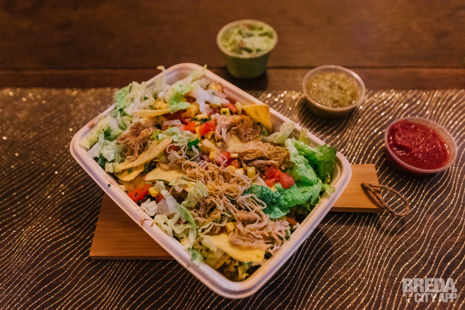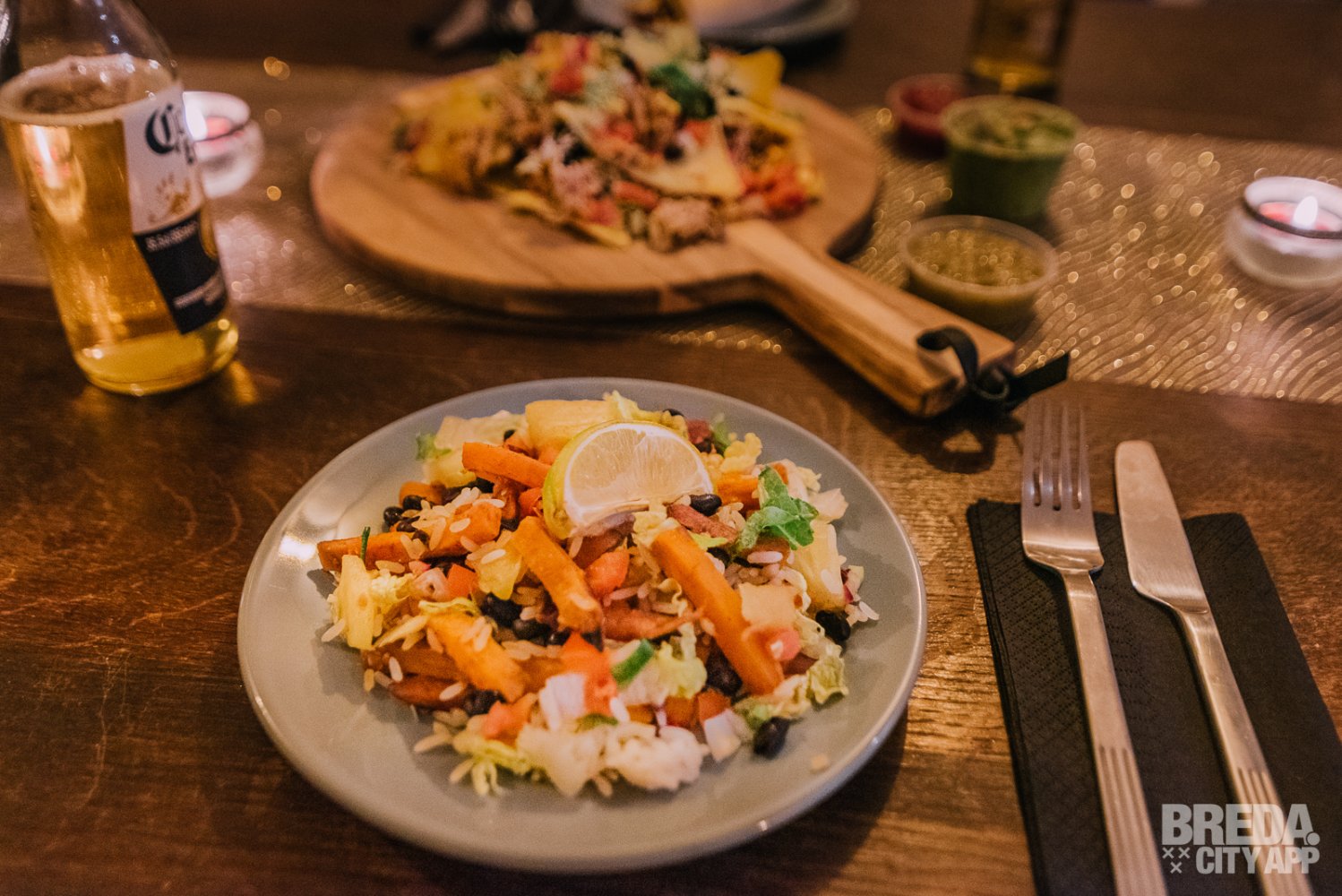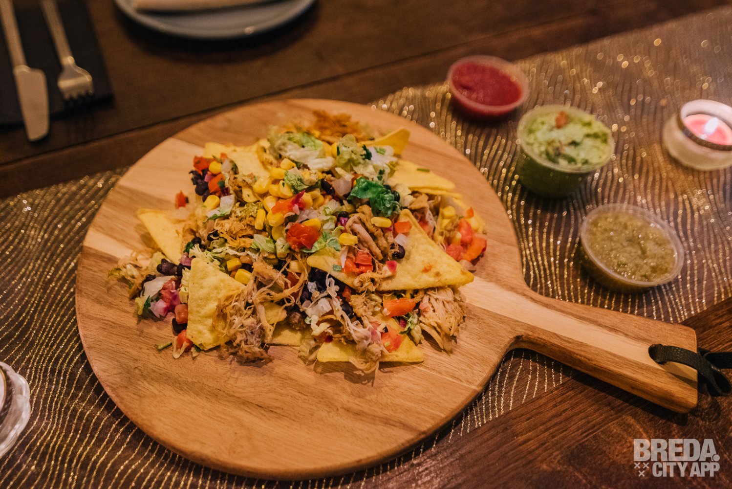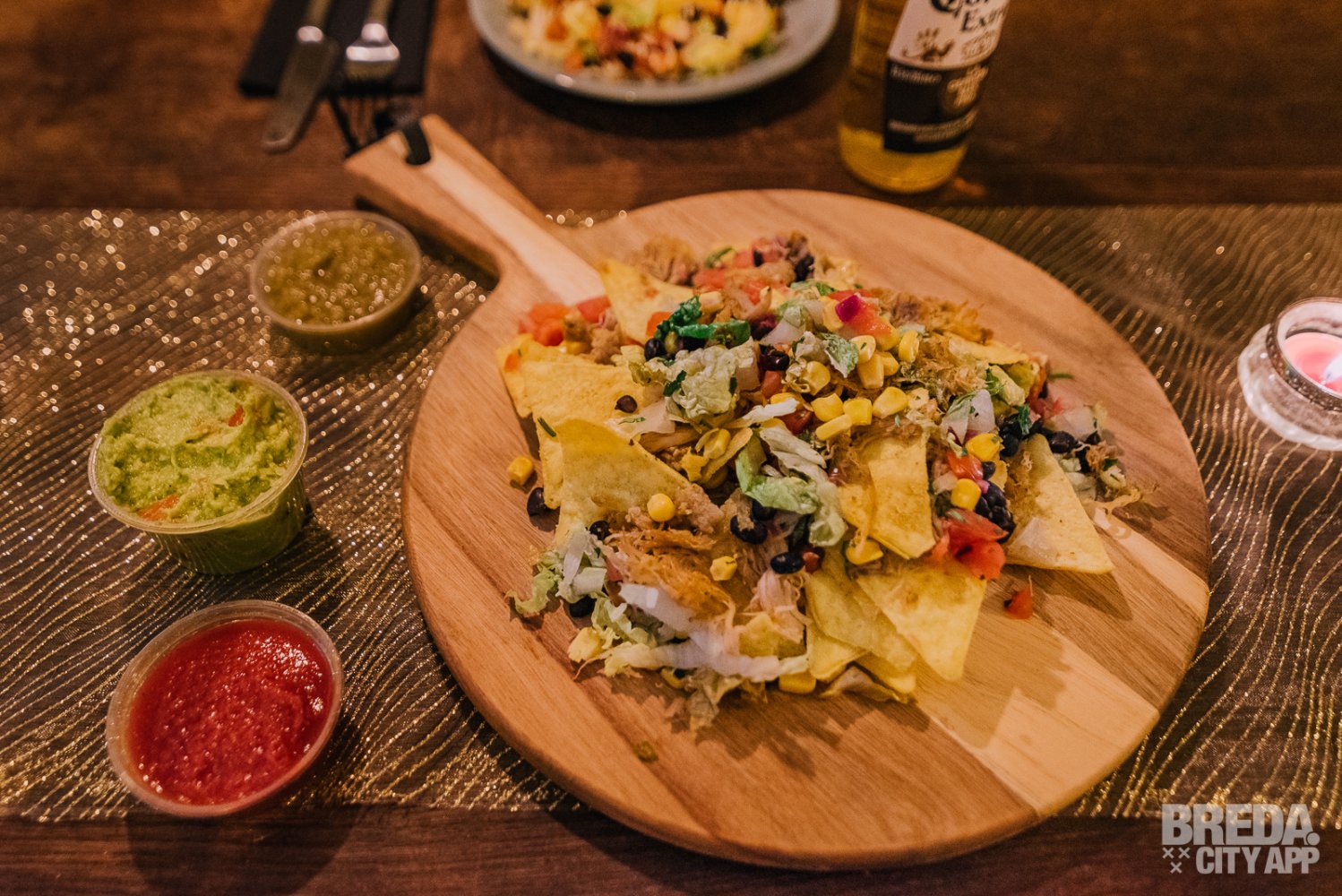 Naast deze twee lekkere gerechten hebben we ook voor een nacho schotel gekozen, die we met zijn tweeën delen. De nacho schotel is gevuld met kip, zwarte bonen, mais, pico de gallo, sla en afgetopt met wat koriander. Omdat we niet allebei helden zijn met pittig eten dippen we de nacho's in de mild gekruide tasty tomato saus, de verse salsa verde en guacamole. Een perfecte combinatie en een echte aanrader!