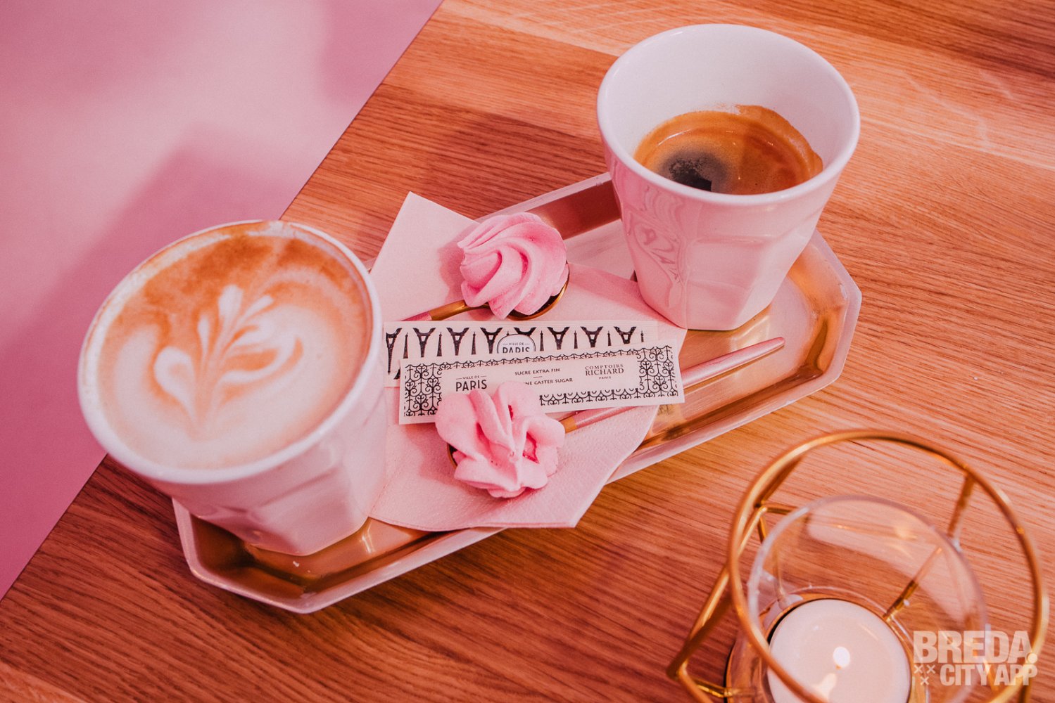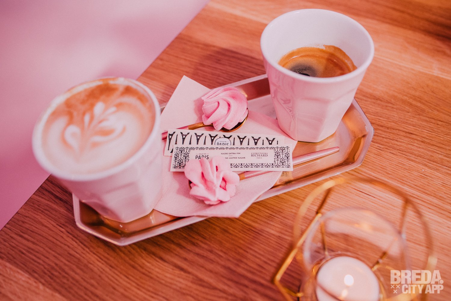 We starten met een cappuccino en een kopje koffie, welke uiteraard in roze kopjes worden geserveerd. Daarbij krijgen we een merengue toefje als koekje.