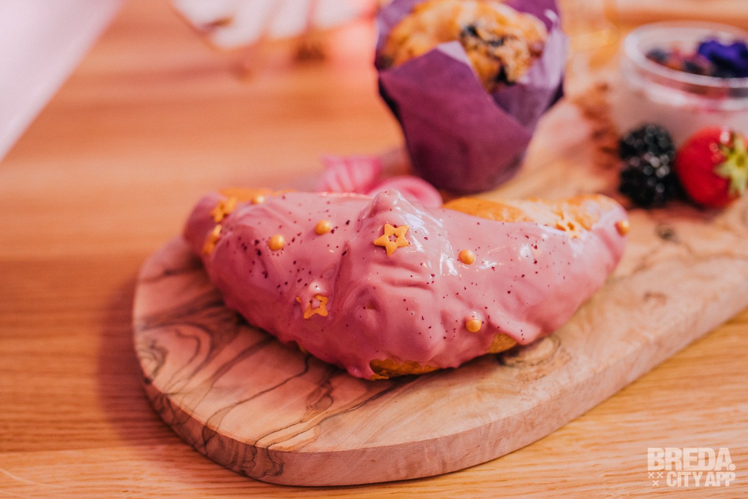 Het ontbijt wordt geserveerd op een mooi houten plankje, dat net zo "insta-waardig" is als de zaak zelf. We krijgen yoghurt met granola en blauwe bessen, een blue berry muffin en een verse croissant met gesmolten witte aardbeienchocolade.
