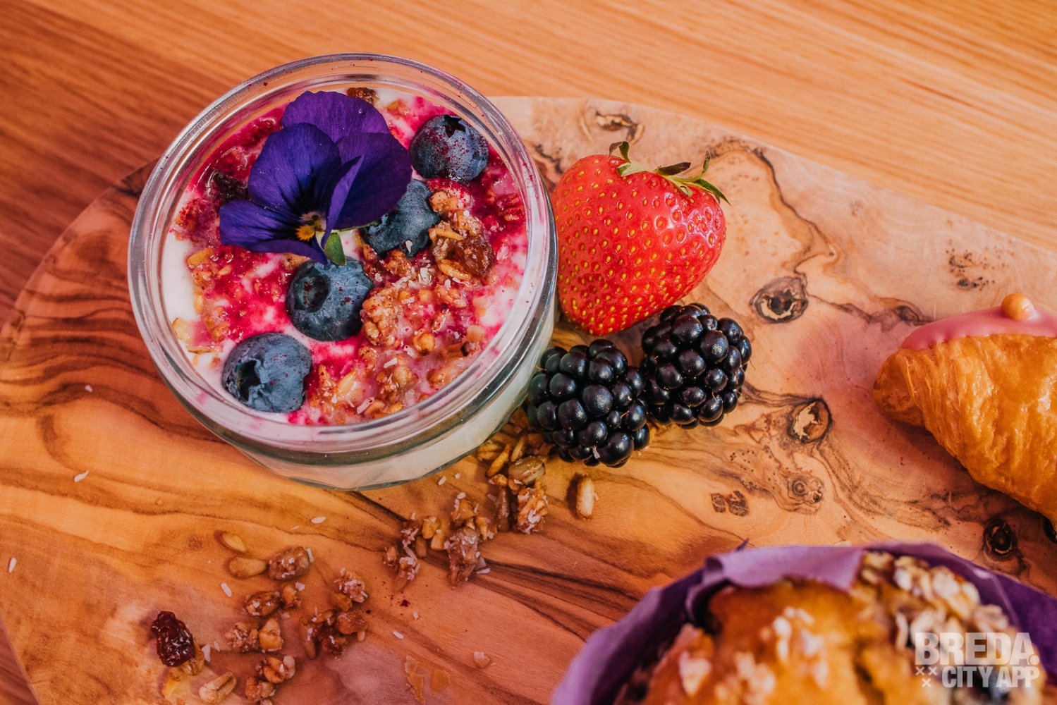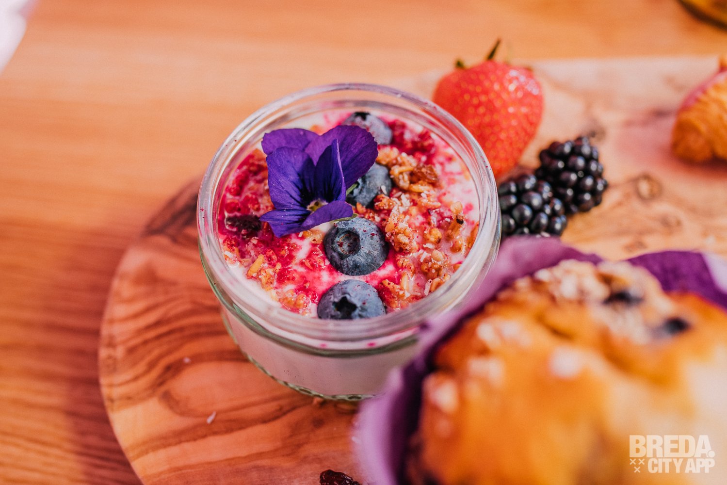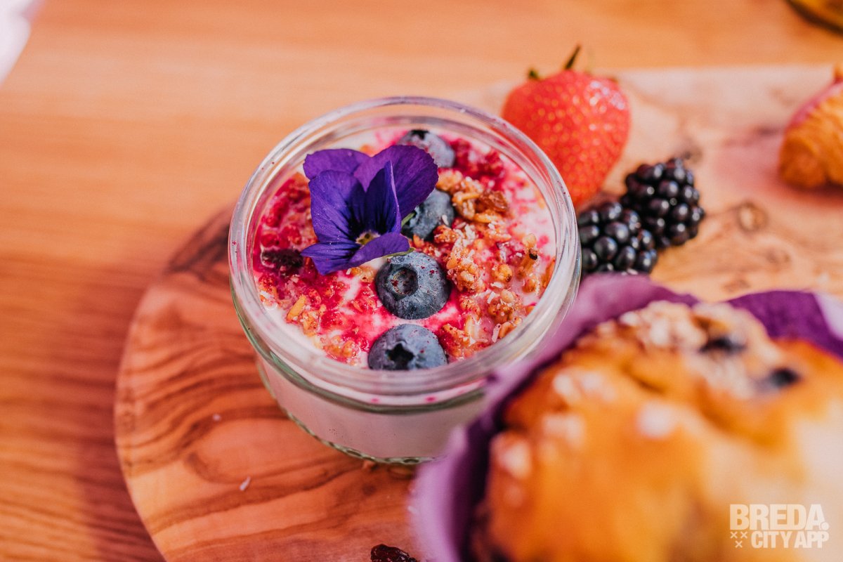 De yoghurt met granola wordt geserveerd in een glazen potje met blauwe bessen en gevriesdroogde framboos. Ernaast liggen bramen en een aardbei. Het eetbare viooltje maakt het plaatje compleet. Wat ons betreft een heerlijke frisse toevoeging aan dit ontbijt.