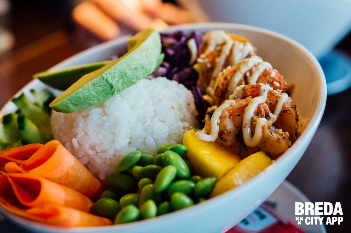 Eenmaal aangeschoven bij een gezellig plekje aan één van de grote raampartijen, restte ons alleen nog de keus: een bowl met gamba’s of pulled pork? Mijn tafelgenoot en ik besloten om allebei een verschillende te nemen. Toen kon het wachten beginnen. Onze eerst poké bowl, spannend!