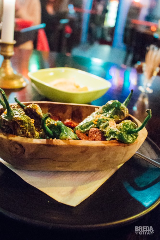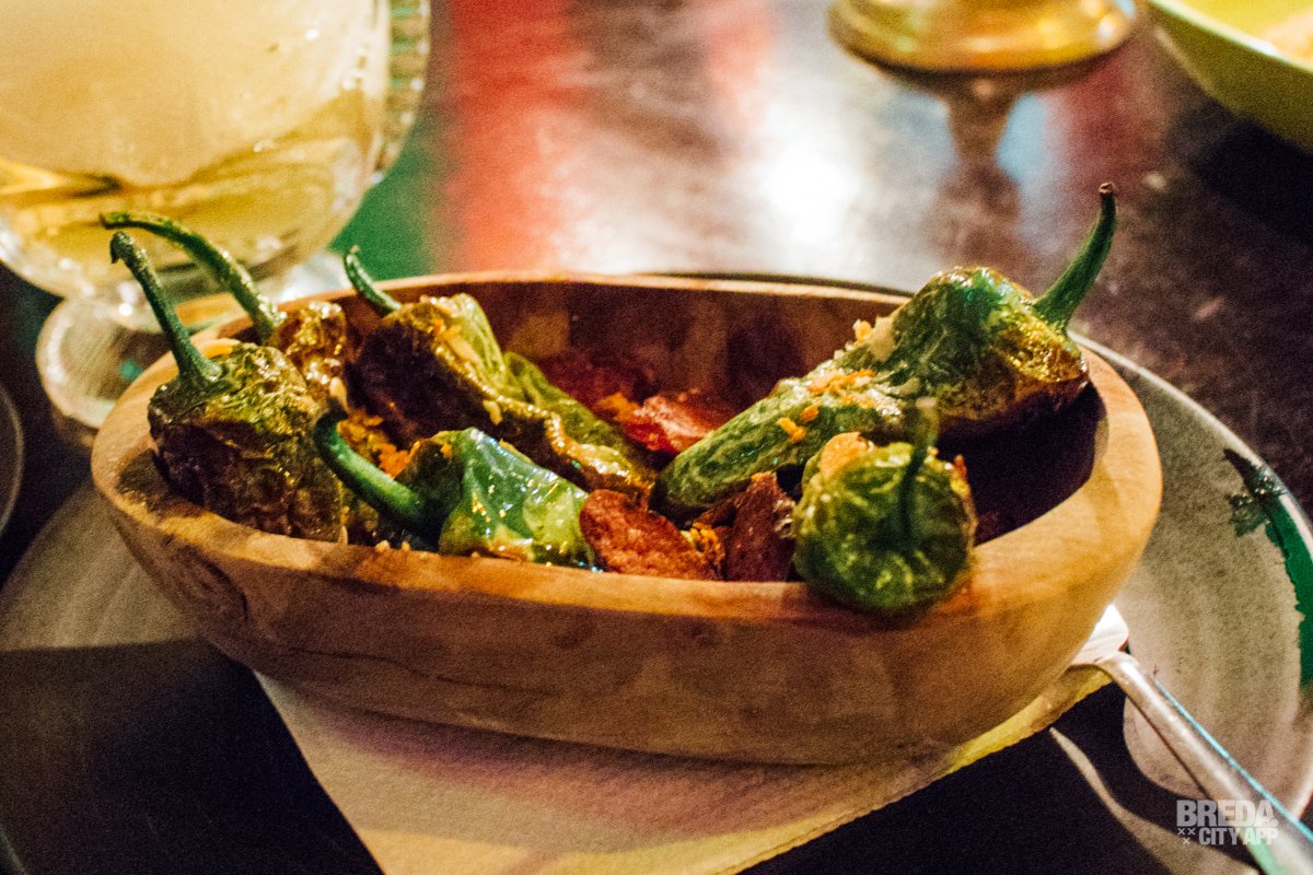 Het gerecht chorizo & padrones verrast ons zeer. Padrones zijn kleine, groene, milde pepers en zijn erg populair in Mexico. Wees wel gewaarschuwd: ongeveer één op de tien padrones is zeer pittig. Durf jij het aan? In combinatie met de chorizo en de amandelcrumble is dit een erg lekker gerecht. Een aanrader!