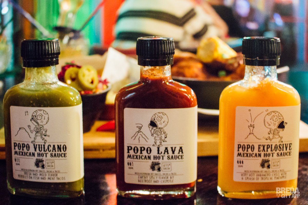 De salsa’s worden geserveerd in leuke flesjes en hebben allemaal een andere pittigheidsgraad. De salsa Popo lava (mild) is gemaakt van rode biet en chipotle. De Popo vulcano (pittig) maken ze van jalapeños en de Popo explosive (hot) is van habaeno chili. Leuk bedacht en een must voor wie van pit houdt.