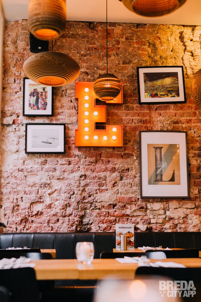 Wandelend door de stad lopen we langs Ellis Breda in de Halstraat. Het ziet er erg gezellig uit en we besluiten. daarom om binnen te stappen. We worden hartelijk begroet door Iwin, de goedlachse Engelstalige gastheer. Iwin begeleidt ons naar ons tafeltje in de hoek, waar we goed zicht hebben op de karakteristieke bakstenen muur waar de naam ELLIS in de schilderijtjes staat geschreven. Super gaaf gedaan!