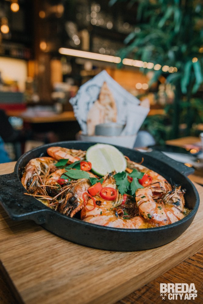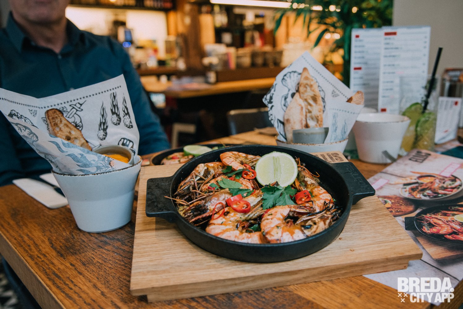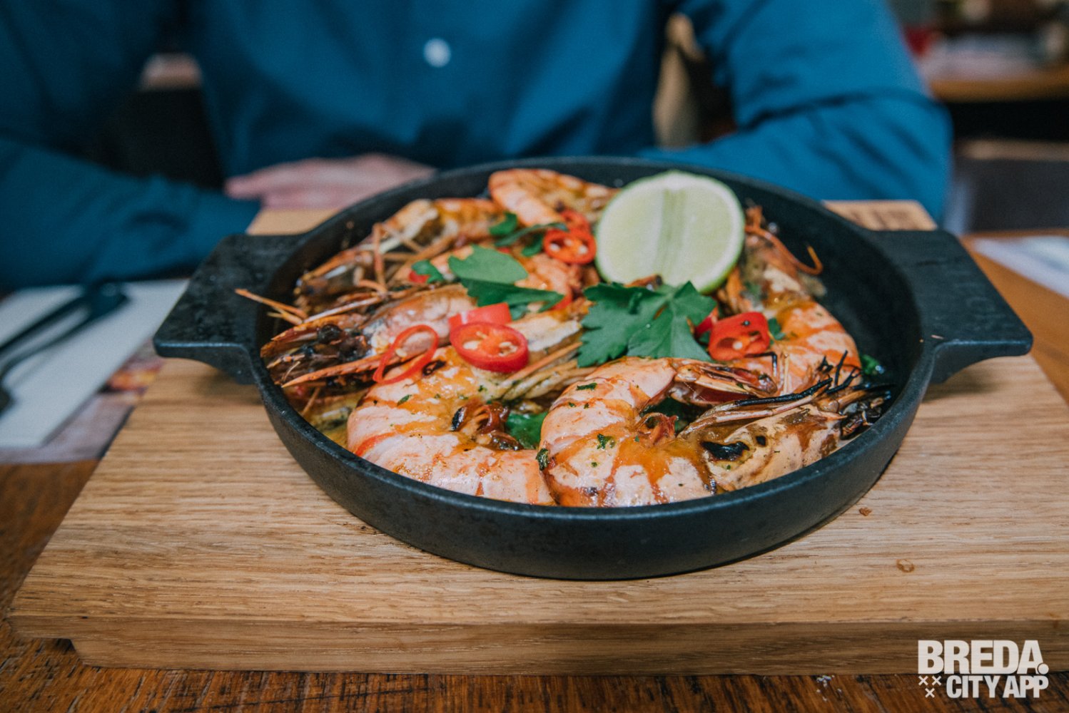 Niet veel later komt Iwin met de nog kokende, stomende pannetjes met ieder zes reuzengamba’s onze kant op, vergezeld door zuurdesemtoast met een knaloranje rouille en een heerlijke groene salade. En dan is er werk aan de winkel; de gamba’s moeten nog uit hun jasje gehaald worden, maar omdat ze heerlijk vers en goed bereid zijn, gaat dit enorm makkelijk. Als liefhebbers van knoflook en zeevruchten, likken we onze vingers er letterlijk bij af.