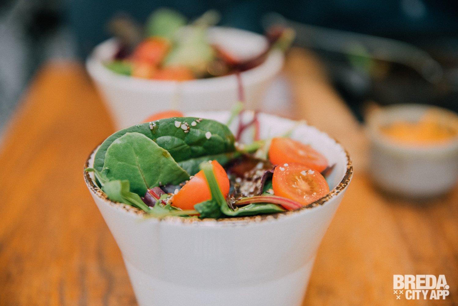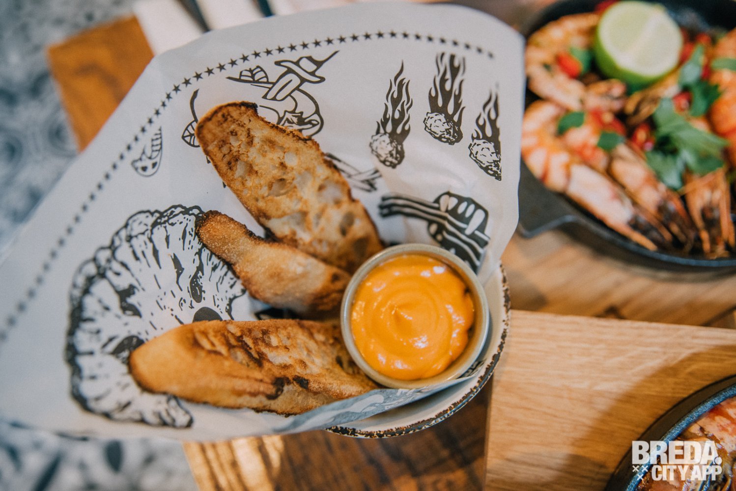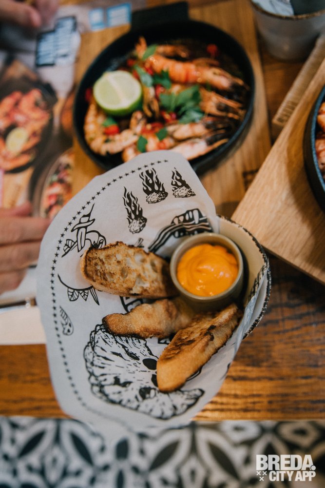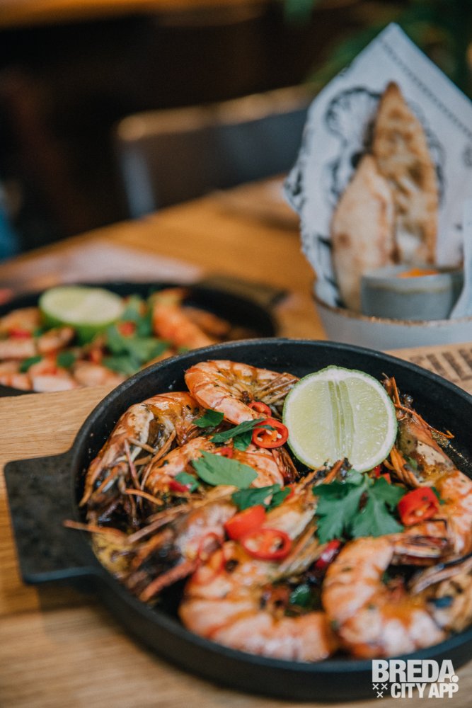 Niet veel later komt Iwin met de nog kokende, stomende pannetjes met ieder zes reuzengamba’s onze kant op, vergezeld door zuurdesemtoast met een knaloranje rouille en een heerlijke groene salade. En dan is er werk aan de winkel; de gamba’s moeten nog uit hun jasje gehaald worden, maar omdat ze heerlijk vers en goed bereid zijn, gaat dit enorm makkelijk. Als liefhebbers van knoflook en zeevruchten, likken we onze vingers er letterlijk bij af.