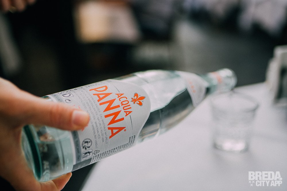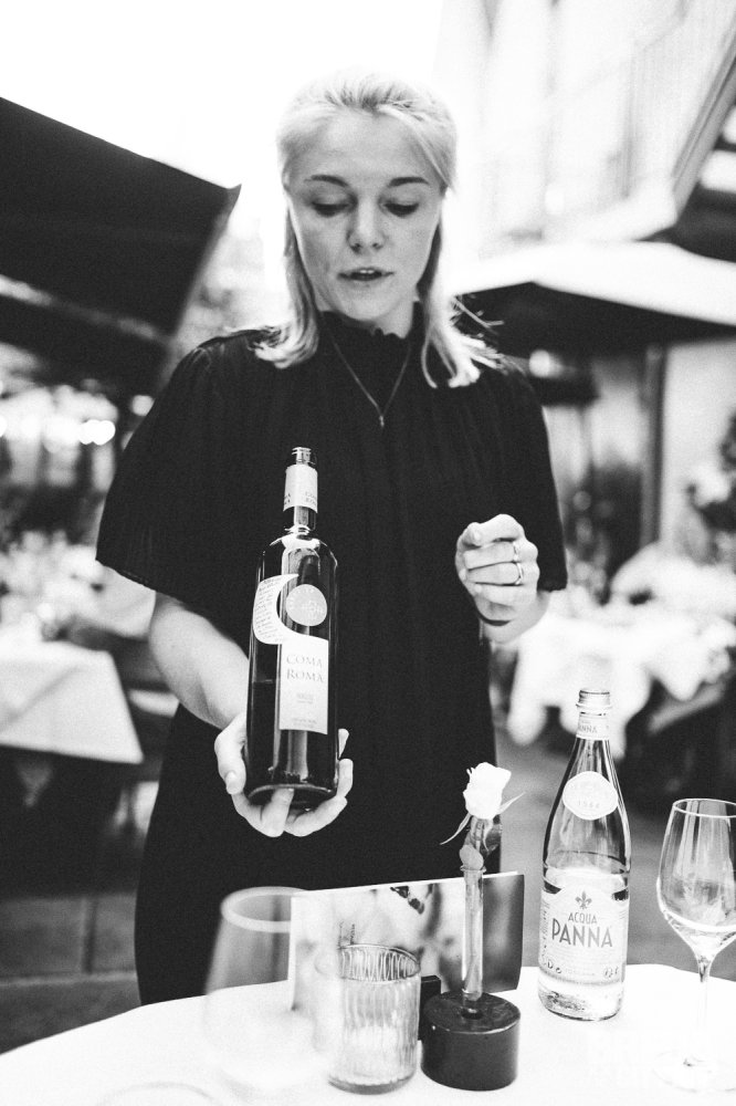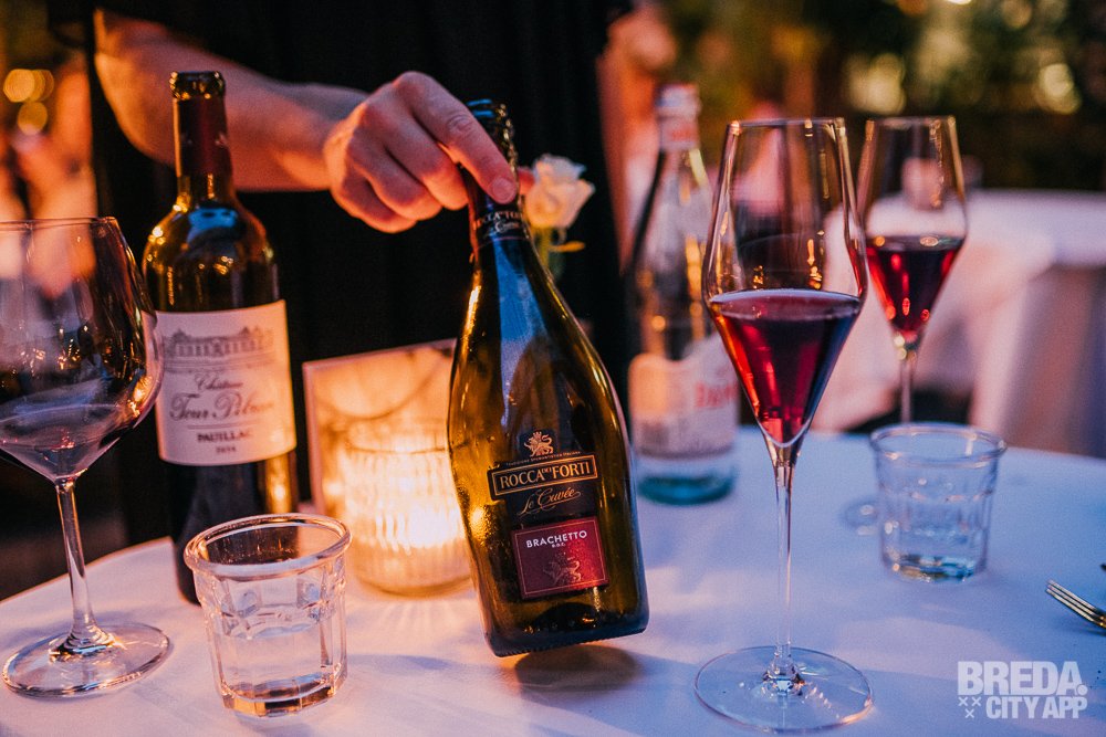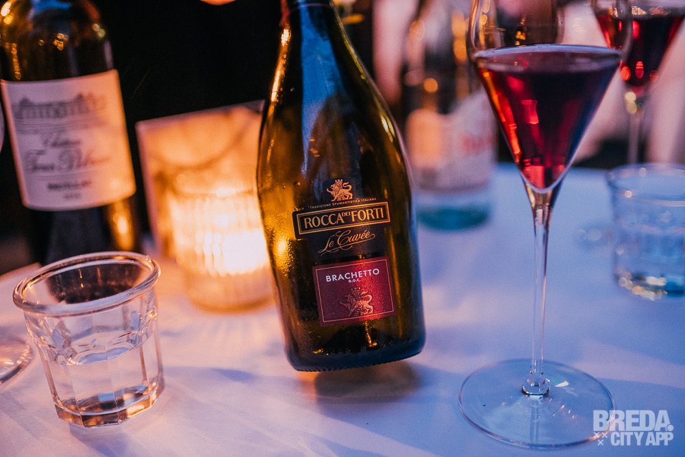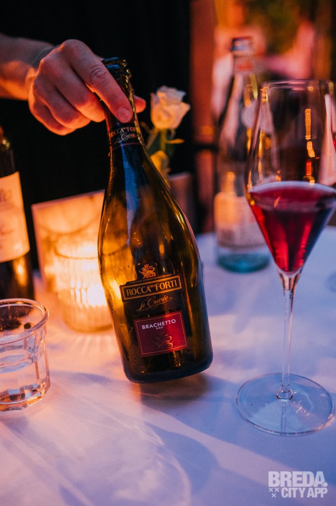 Bij het dessert drinken we een Rocca dei Forti Brachetto Vino Spumante. Door de druiven niet helemaal uit te laten vergisten blijft een natuurlijk restzoet behouden. We proeven bramen, rijpe bosaardbeien en framboos, met op de achtergrond een lichte kruidigheid. Een natuurlijk frisse zuurgraad geeft de medium volle en zoetige smaak een mooi tegenwicht. Bij het drinken van deze wijn staan we ook even stil bij dit gezellige pleintje. Ondanks dat je eigenlijk middenin het centrum zit, voelt het voor ons alsof we in het buitenland zitten.