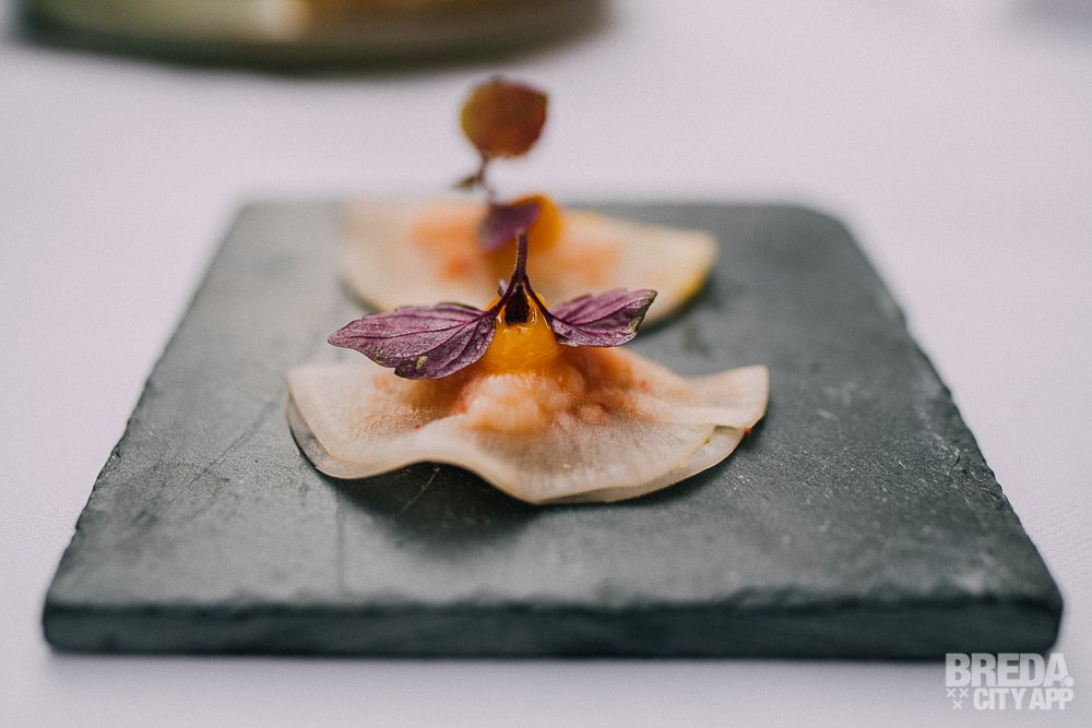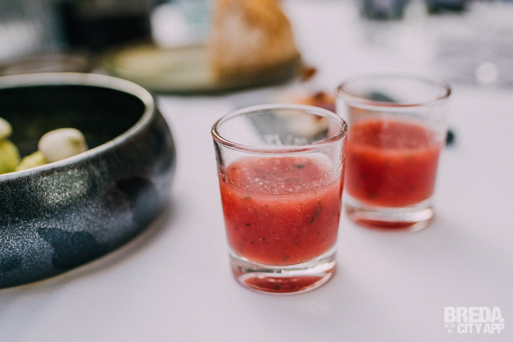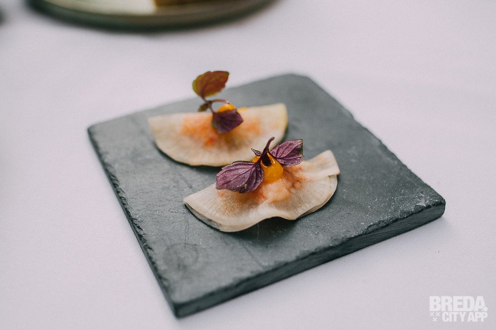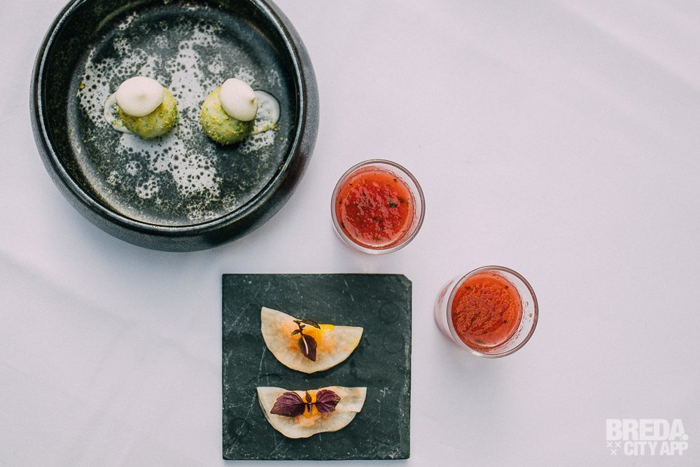 Uiteraard starten we onze culinaire reis met een culinair aperitief, of beter gezegd drie aperitiefjes! We krijgen een mousse van doperwten met gelei van wasabi, een gazpacho van watermeloen en een dim sum van rettich gevuld met rivierkreeften. Op de mousse van doperwten zit een licht zoet merengue schuimpje, wat verrassend fijn samen gaat met de mousse. De rettich geeft een mooie aardse toon en een lekkere bite aan de dim sum. De gazpacho is lekker fris, mede door de toevoeging van munt.