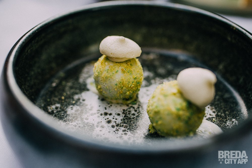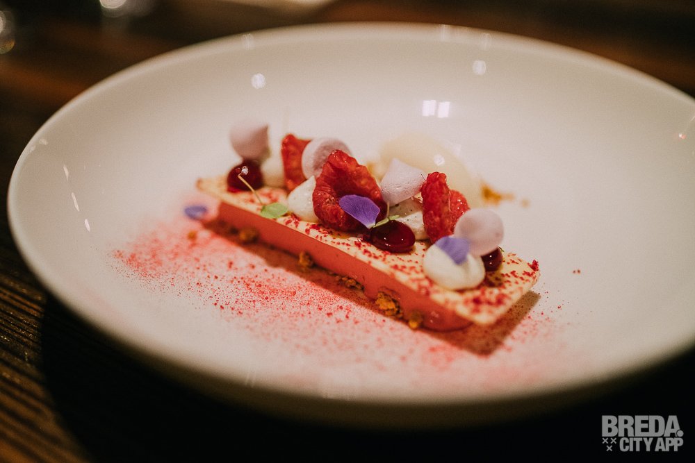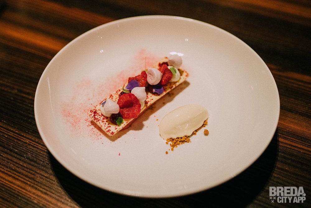 Als dessert krijgen we een mousse van framboos met een gallet van witte chocolat, hangop en roomijs van thais limoenblad. Wederom een prachtig gerecht om te zien en hoog op smaak. De volle smaak van de chocolade wordt prachtig gecomplimenteerd door de frisheid van de framboos en het ijs.