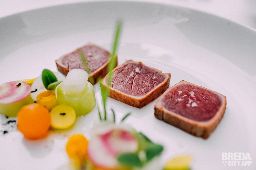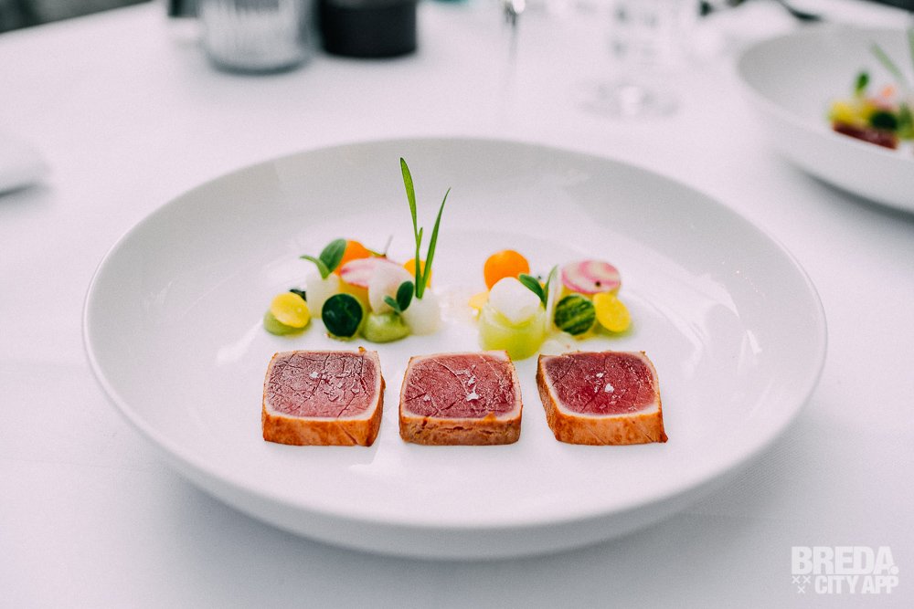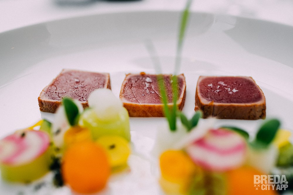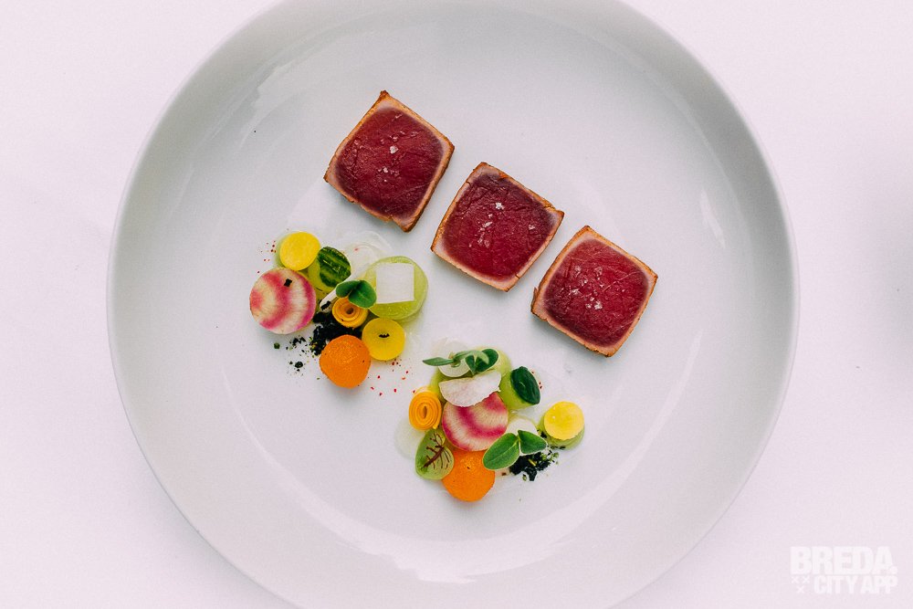 De eerste gang bestaat uit drie geschroeide stukjes tonijn met ceviche, mango, rettich en komkommer. Het gerecht is niet alleen een lust voor het oog, maar smaakt ook heerlijk. De tonijn smelt op je tong en wordt mooi gecomplimenteerd door de frisse tonen van de groentes.
