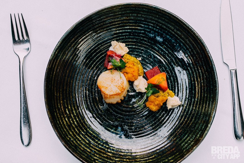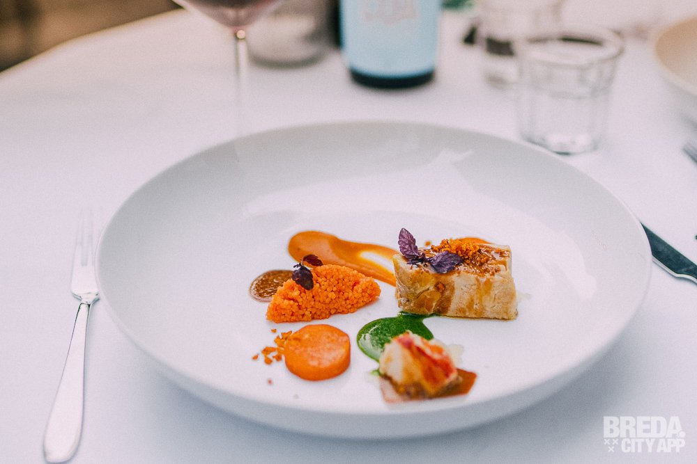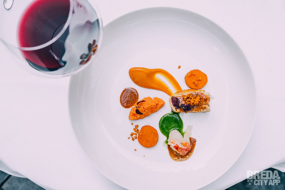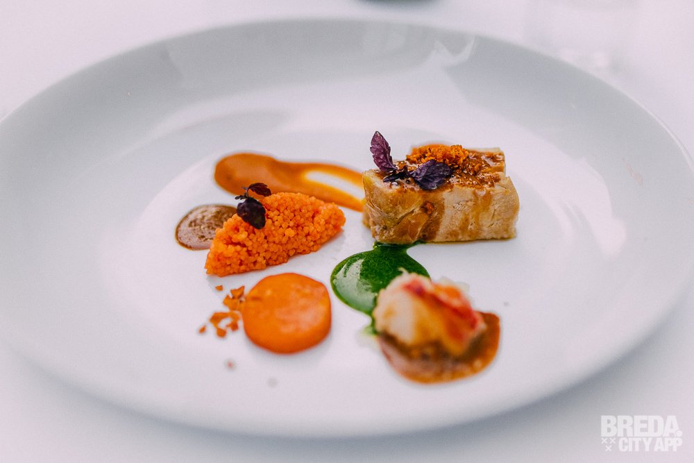 Bij de derde gang staat hoender en kreeft centraal. Het gerecht wordt als een schilderij op het witte bord geserveerd met kreeften jus, couscous, wortel en tandoori. De verschillende smaken en texturen vormen samen een ware smaakexplosie. Dorus en zijn team blijven ons altijd verrassen met hun mooie combinaties.