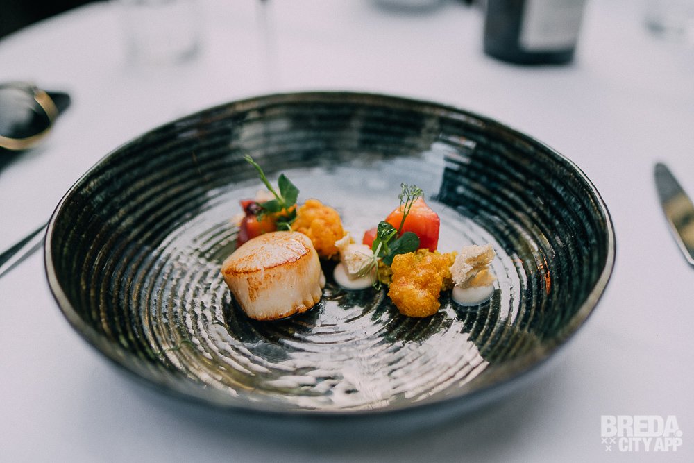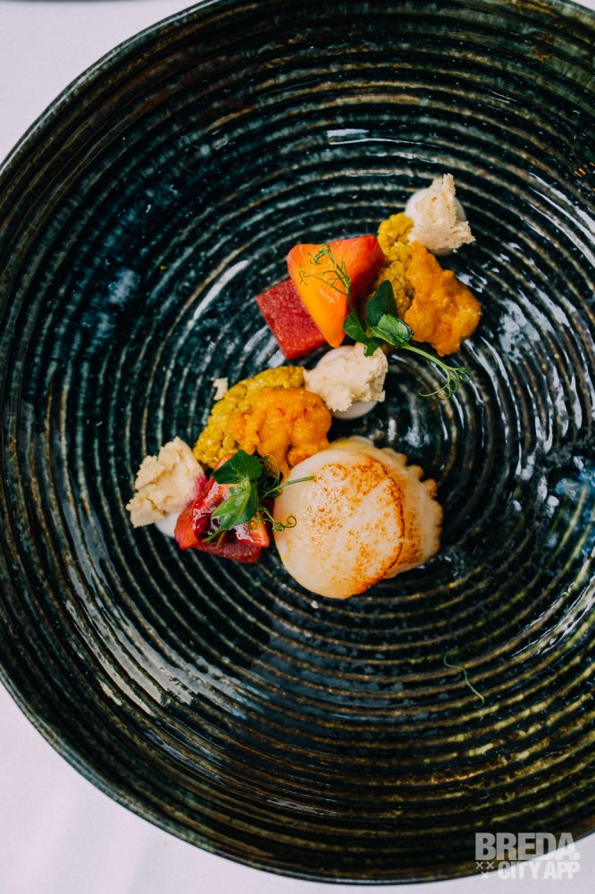 Met de tweede gang worden we getrakteerd op gebakken coquille met watermeloen, gefrituurde rivierkreeften, tofu en een spongecake van dashi. Dashi is een bouillon die in de Japanse keuken gebruikt wordt als basis voor talloze recepten. Als liefhebbers van coquille kan onze avond nu al niet meer stuk! Dit gerecht heeft een prachtige balans van verschillende texturen en smaken.