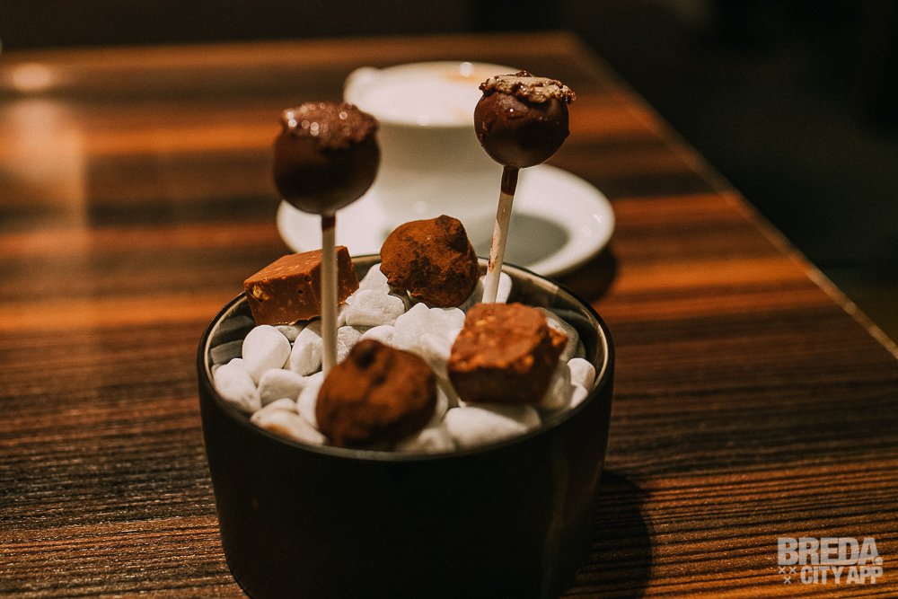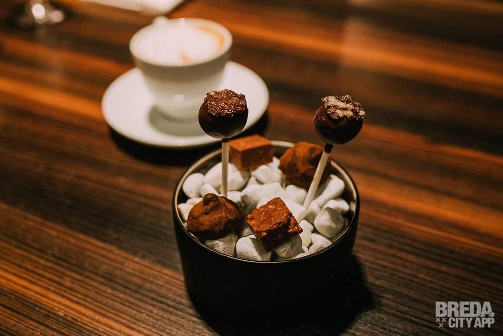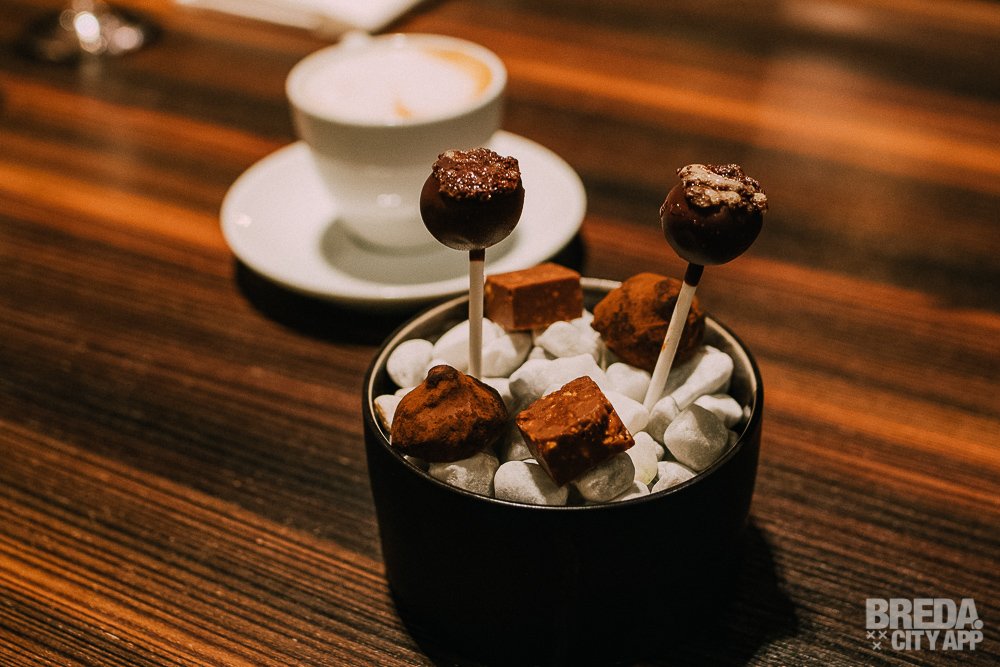 We sluiten onze culinaire avond af met koffie en friandises. We krijgen een bonbon van popcorn en gezouten caramel, een lolly van witte chocolat en cuarenta y tres en een chocolade roomtruffel. Een heerlijke afsluiting van een fantastische avond. Het summervibes menu kost 50 euro, wat het naar onze mening meer dan waard is. Chocolat staat garant voor een culinaire avond uit en op het sfeervolle terras lijkt het net of je even met vakantie bent.