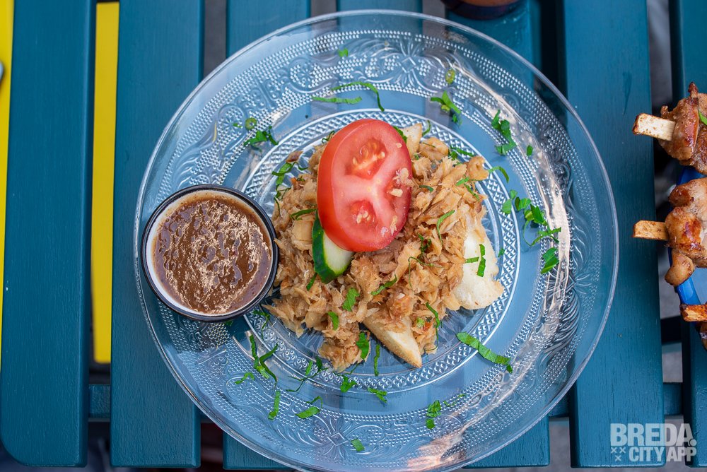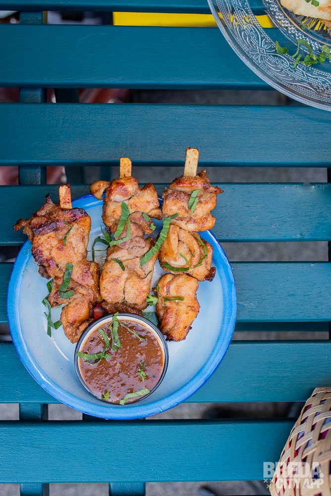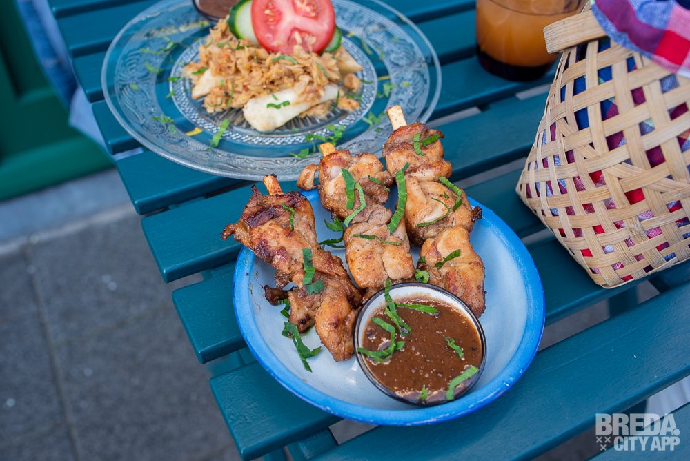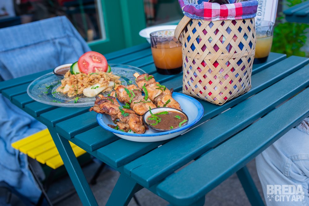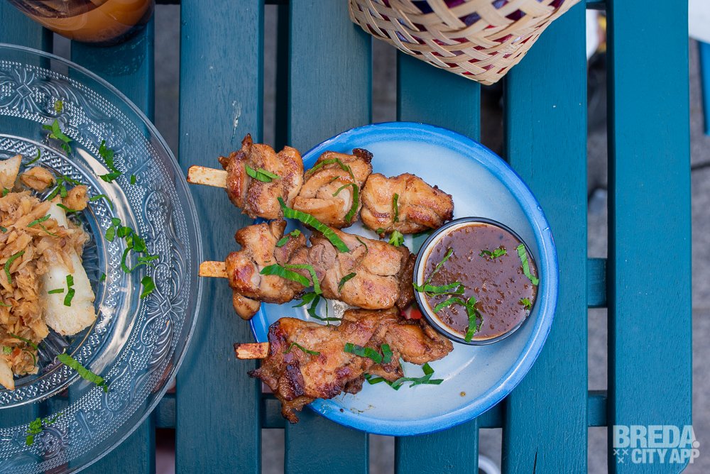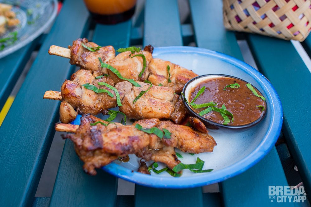 Het tweede voorgerecht zijn kipspiesjes van kippendij-filet met daarbij pindasaus waar wat Surinaamse pit aan toegevoegd is. De saus is een klein beetje pittig en dus ook voor vrijwel iedereen te eten.
