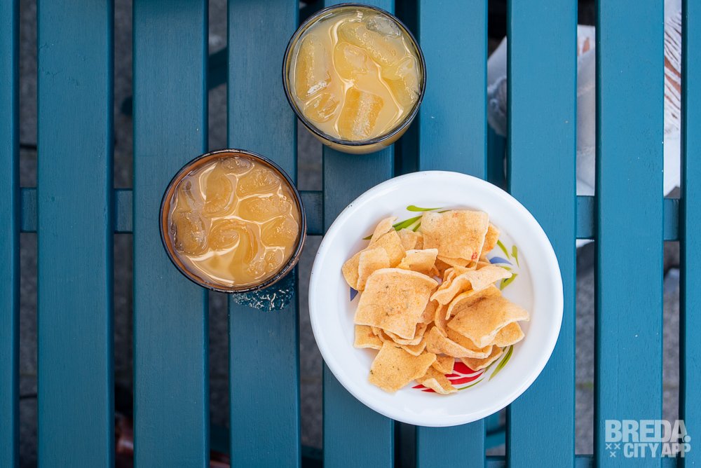 Als we binnenkomen worden we direct hartelijk ontvangen. We mogen zelf een tafeltje uitkiezen en besluiten om buiten te gaan zitten. Als we plaats nemen worden we direct verrast met een drankje van verschillende tropische vruchten en wat kroepoek, erg lekker!