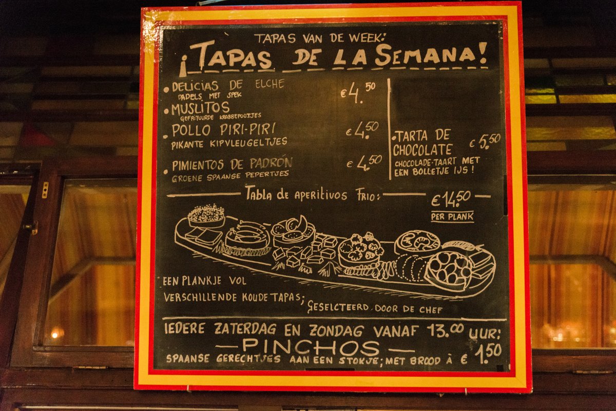 Naast de vaste kaart zijn er wekelijks wisselende gerechten: tapas de la semana (tapas van de week). Op het menu staan: Tapas calientes (warme tapas), tapas frias (koude tapas), especialidades (specialiteiten van het huis), nuevo (nieuwe tapas) en vegetarische tapas. Voor degene die niet kunnen kiezen wordt er een speciaal menu samengesteld door de kok, je krijgt dan een combinatie van alle tapas. Wij besloten ons te laten verrassen!