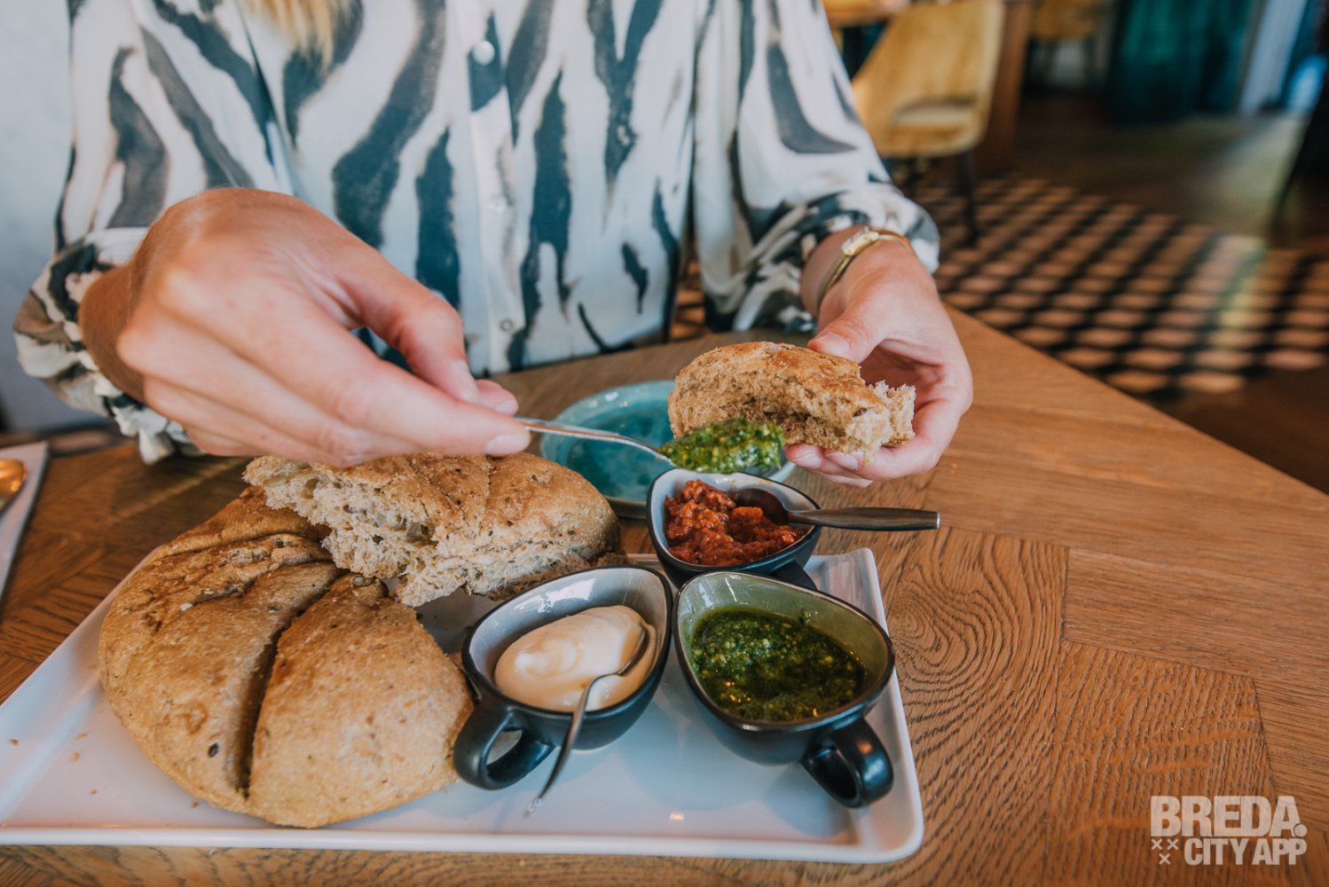 Al kletsend en genietend van de drankjes krijgen wij een Toscaans warm breekbrood met tomatentapenade, groene pesto en aioli. Het valt ons op dat het voor een maandag gezellig druk is. We zitten aan een mooi tafeltje bij het raam en hebben zicht op de gehele zaak. De zaak is overigens sfeervol aangekleed met mooie materialen en authentieke details. De glas in lood ramen passen mooi in de jaren ’30 stijl van de Belcrum.