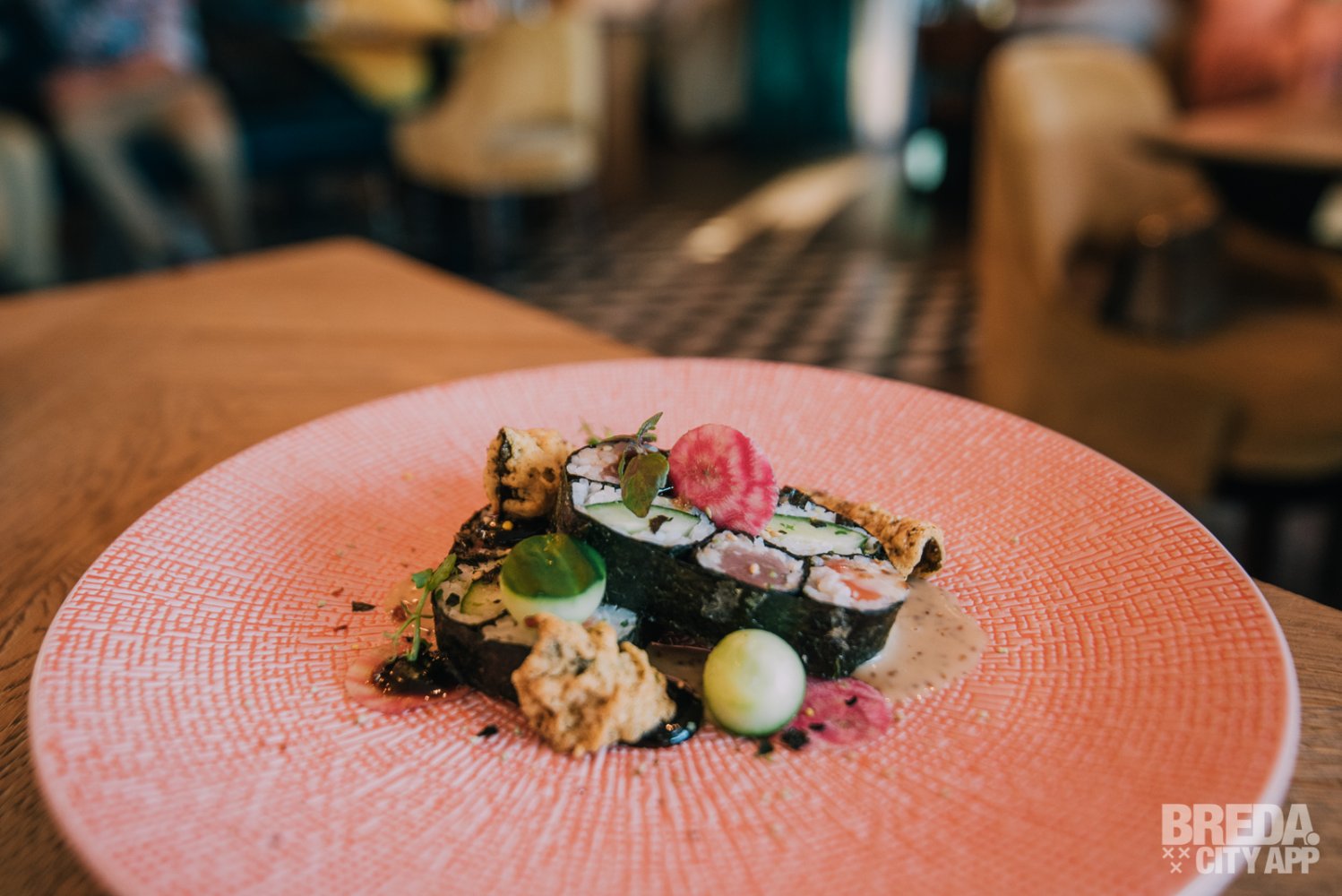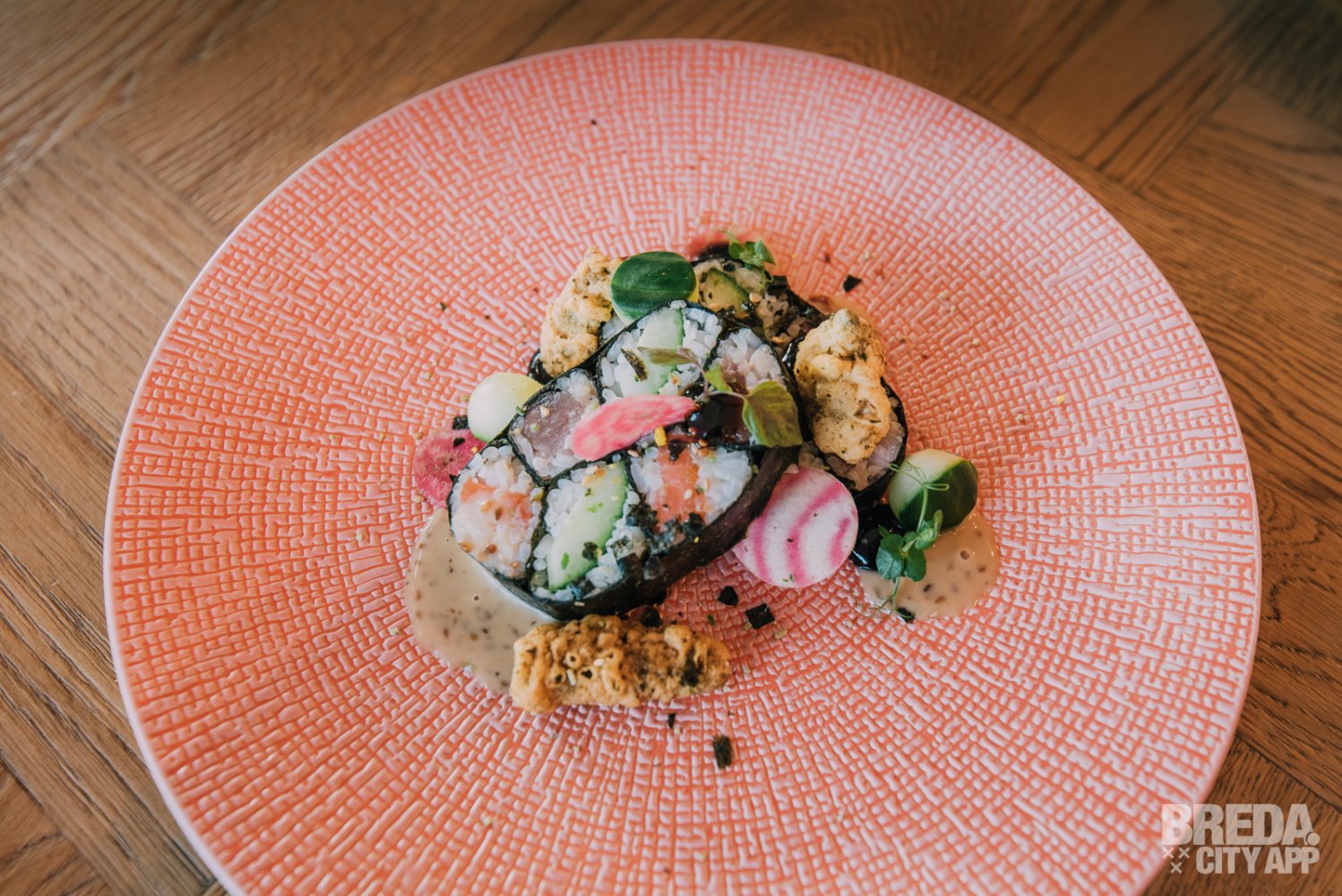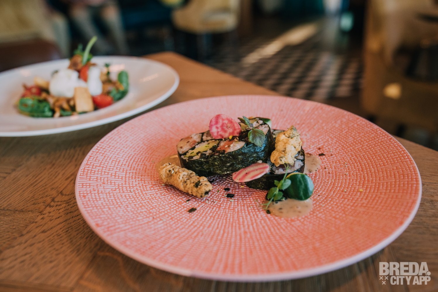 We krijgen als eerste gang deze avond de sushi XXL en de burrata geserveerd. De sushi is een mooi opgemaakt licht voorgerecht. In plaats van losse rollen hebben ze de zalm, tonijn en komkommer samengevoegd in één gerecht. Dit alles lekker gecombineerd met een sojagel, sesamdressing, frisse radijs en een zeewier krokantje. Hierbij wordt Domaine La Lande Chardonnay geschonken. Een herkenbare wijn in geur en smaak, aangenaam fruitig met tonen van appel en citroen.